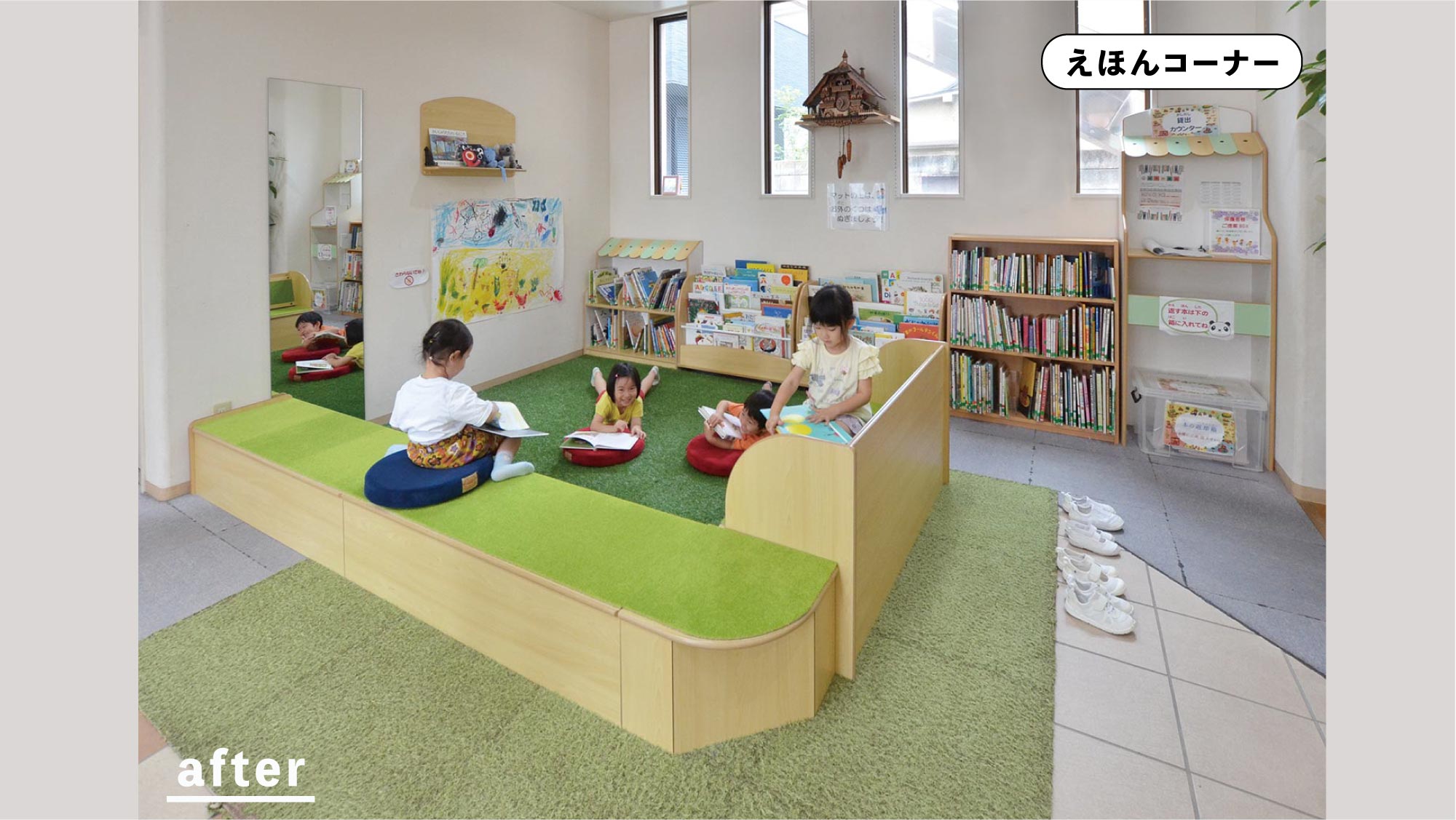 エントランスにある、えほんコーナー。お迎えに来た保護者と一緒に読めるように 両面から使えるベンチで囲いました。