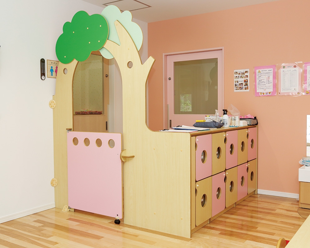 1歳児のカラーはピンク。入り口のゲートパネルが部屋のシンボルになっており、保護者、子どもたちにも好評です。