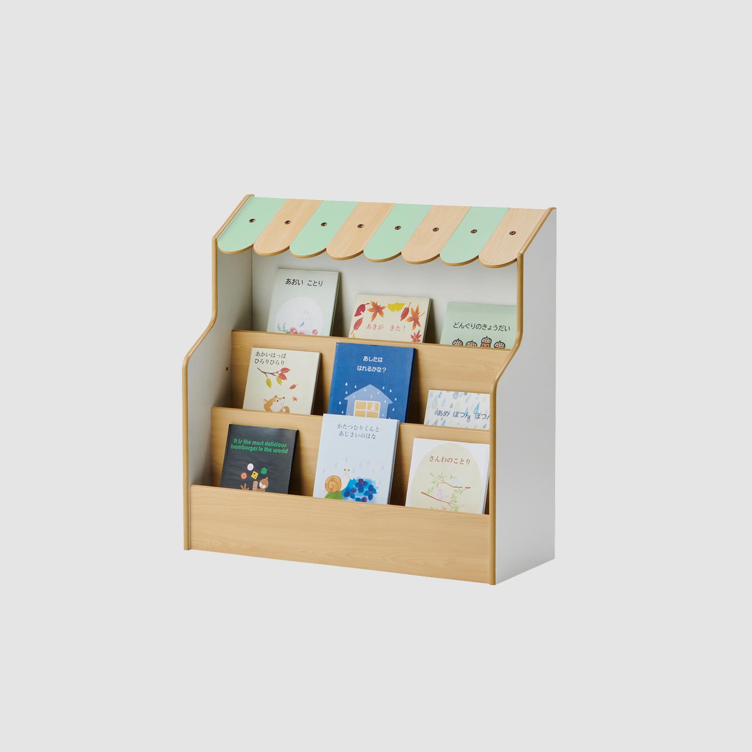 面差しタイプは、収納するすべての絵本の表紙が見えるようになっています。絵本の表紙が見えることで目に入りやすく、並べてある絵本に興味がわきます。展示スペースのある、えほんマルシェ[絵本棚H90 オープン・展示棚]や、えほんマルシェ[絵本棚H120 オープン・展示棚]と合わせて使い、おすすめ絵本の延長として絵本を紹介することもできます。