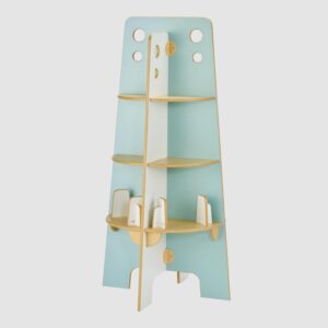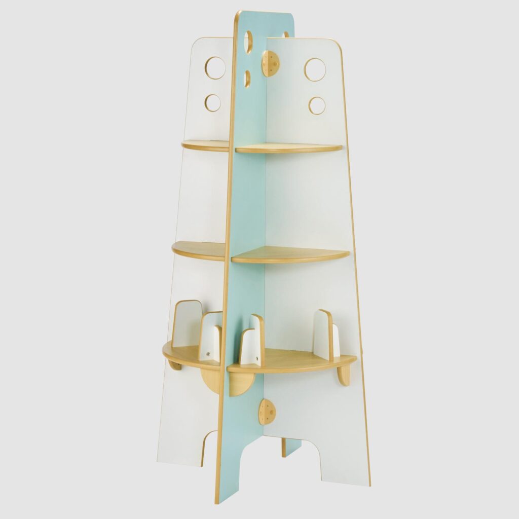 見る角度によって印象が変わるえほんタワー。コーナーのシンボルにぴったりです。
