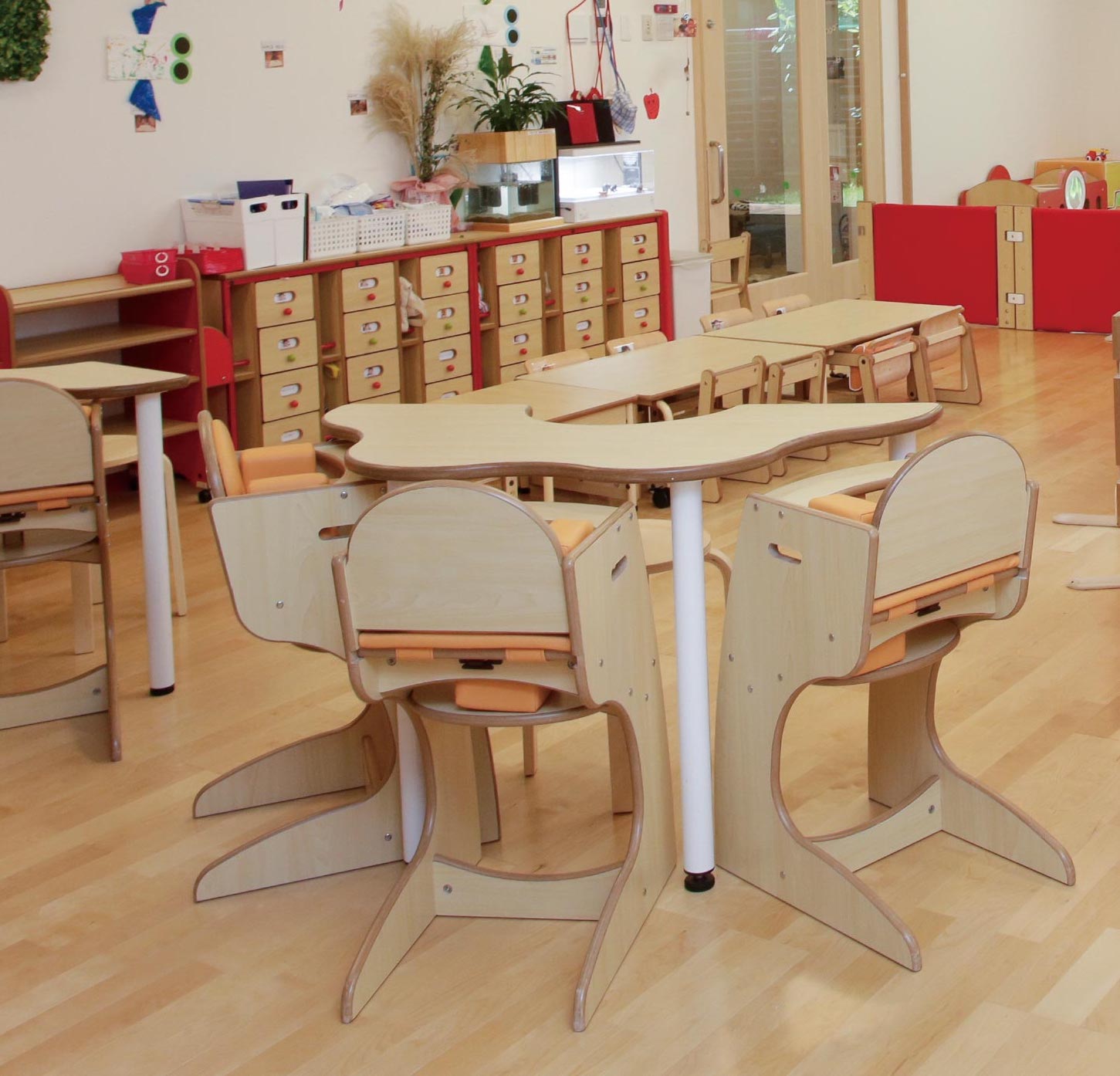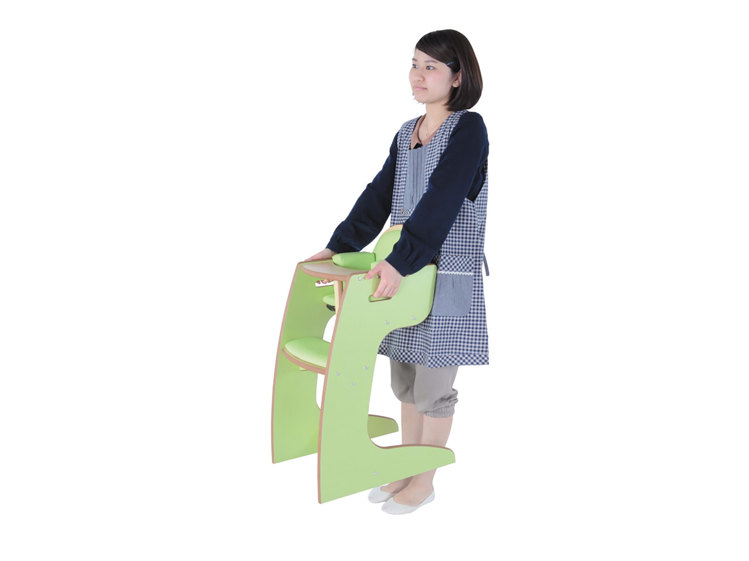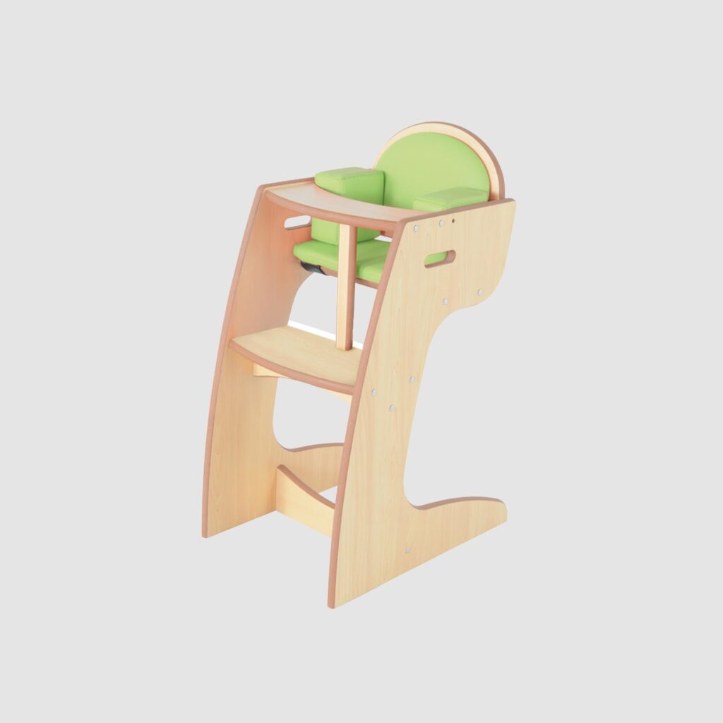 離乳食の食事の援助にぴったりな0歳児向けのCqハイチェア。イスのクッションに加え、サイドのクッションが子どもの体をしっかりと包み込みます。高さのあるテーブルでの食事援助になるので、保育士の腰への負担を軽減します。