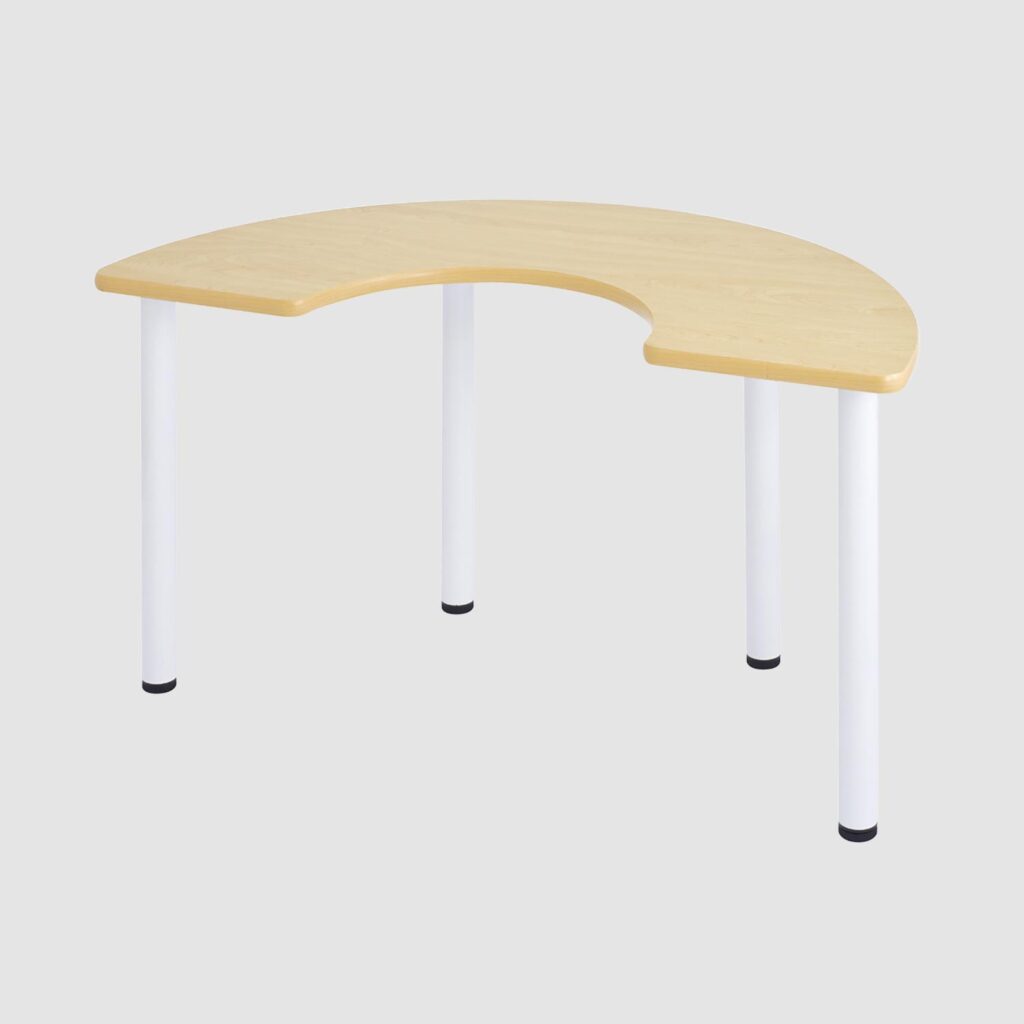 半円のへこみ部分に保育士が座って乳児の食事をサポートできるテーブルです。高さはハイとローの2タイプ。高さのあるハイチェアに合わせる場合はハイタイプを使います。