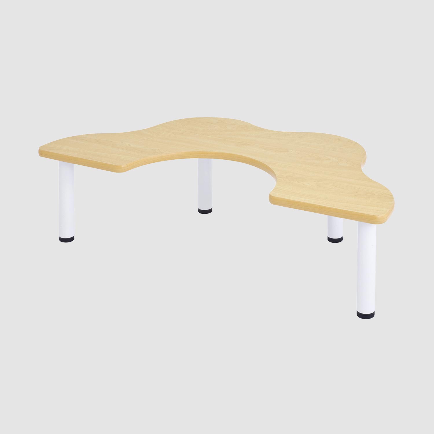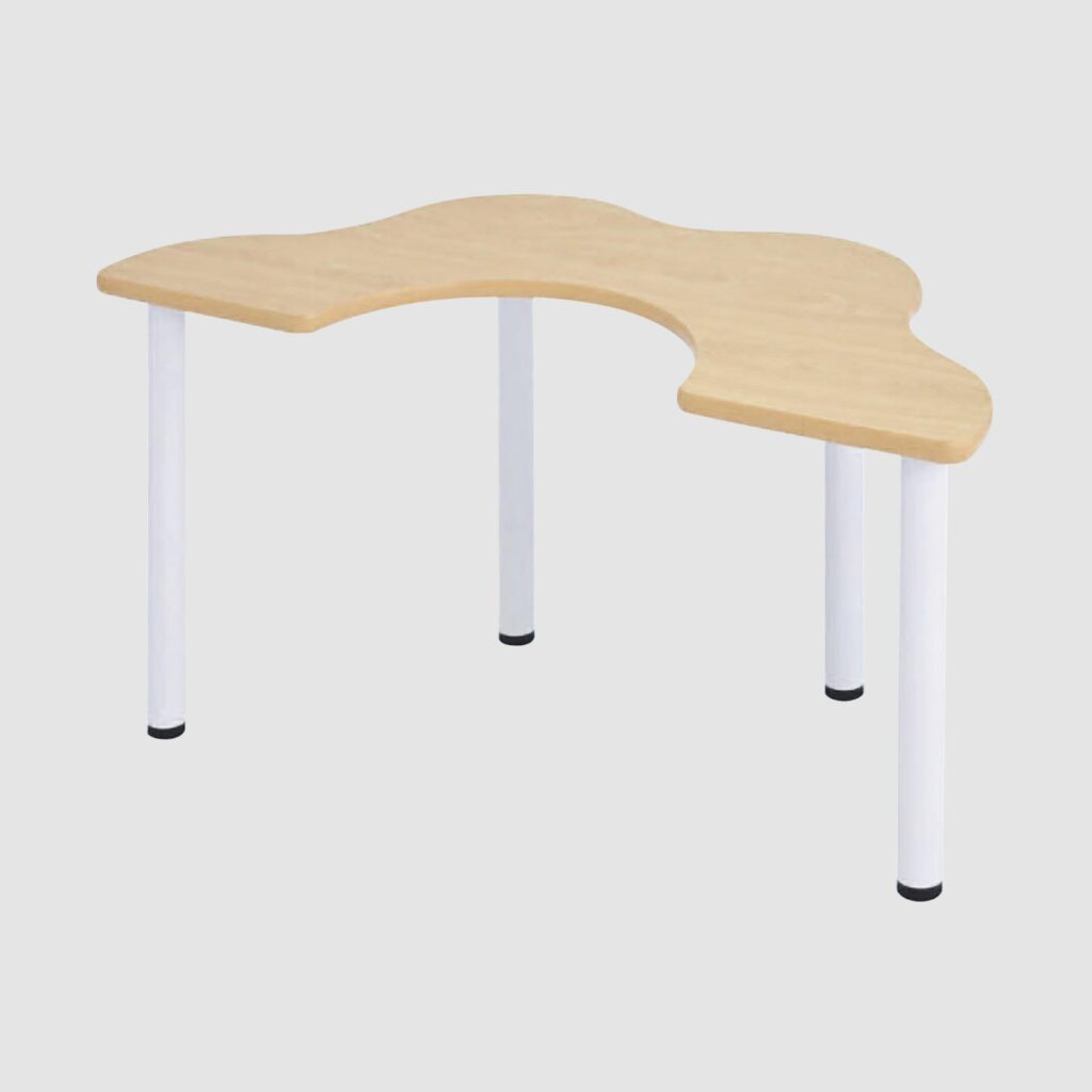 半円のへこみ部分に保育士が座って乳児の食事をサポートできるテーブルです。子どもが座るテーブルの外側にもへこみがあるので、子どもの体がフィットします。高さはハイとローの2タイプ。高さのあるハイチェアに合わせる場合はハイタイプを使います。