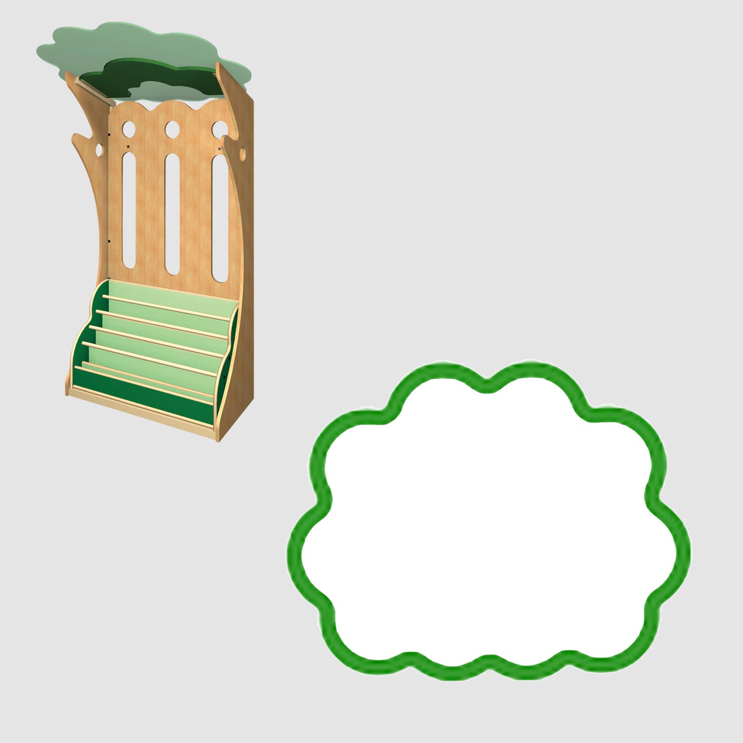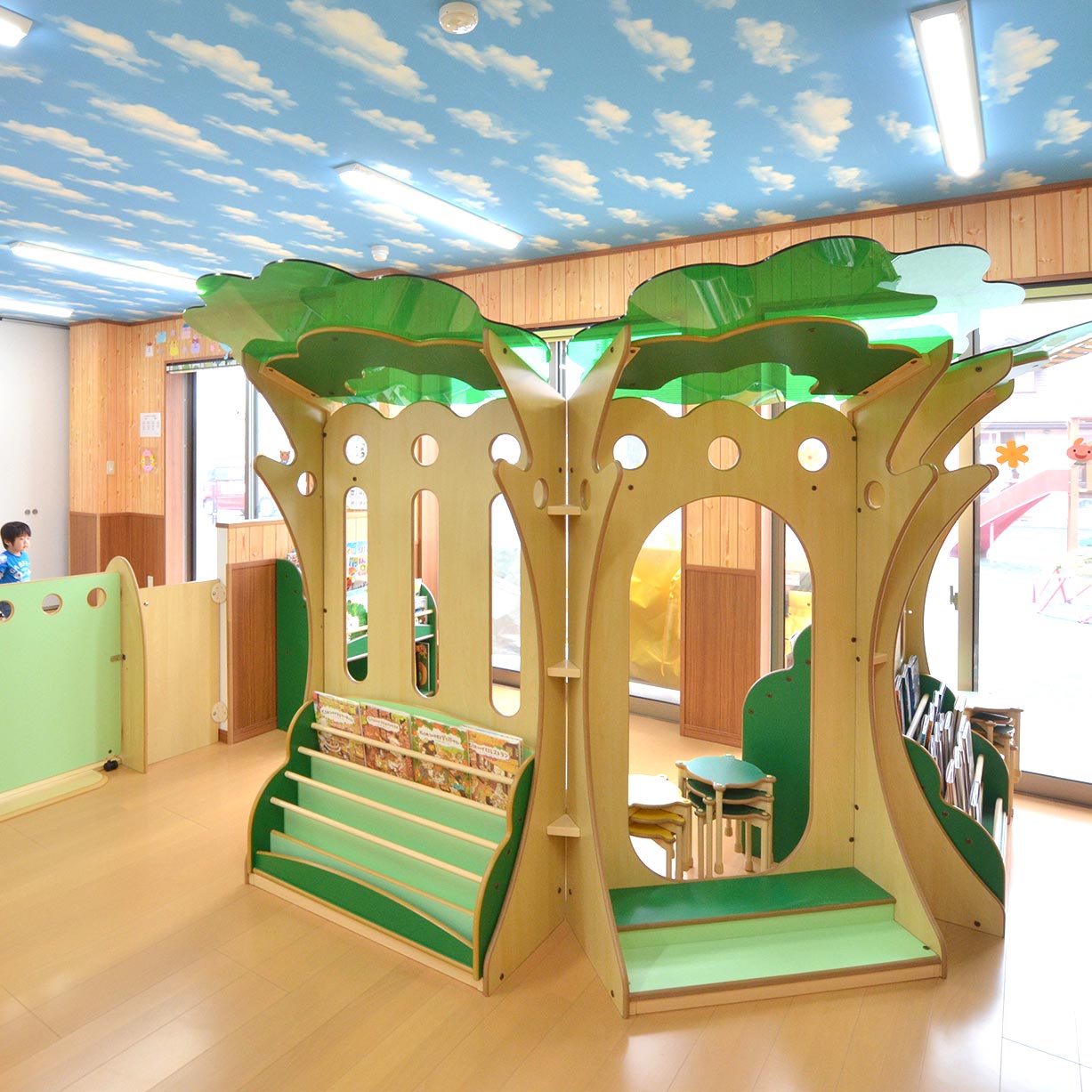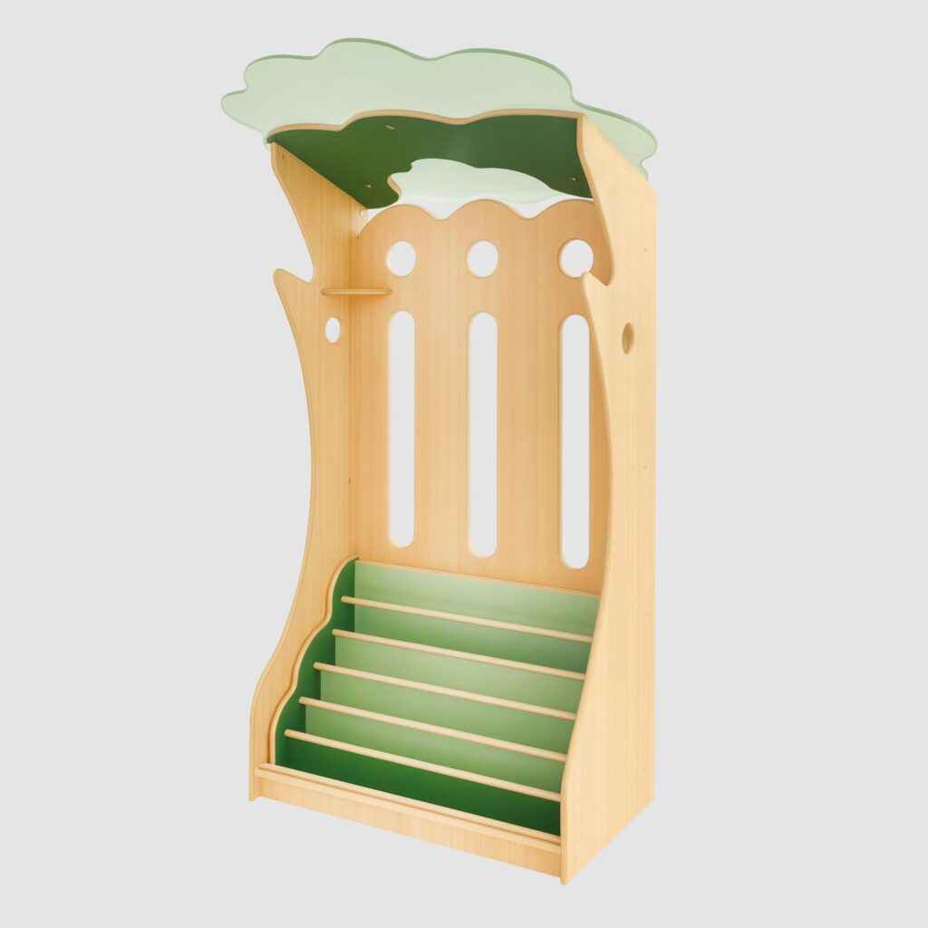 木をモチーフにした存在感のある絵本棚です。連結すると大きな木のかたちになり、印象的なえほんコーナーをつくるのに最適です。