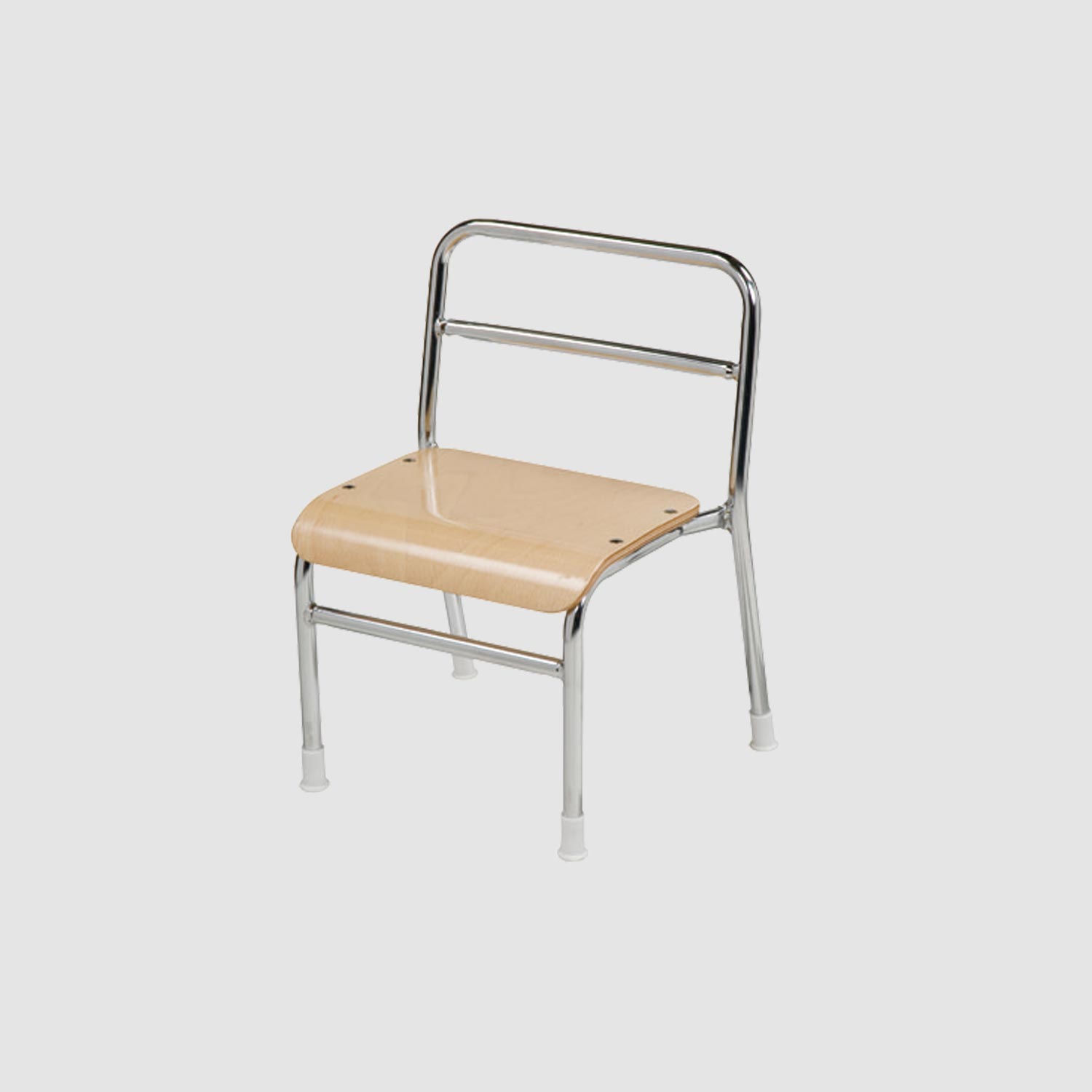 背部分がフレームのみのチェア。姿勢よく背筋を伸ばし、脚を床にしっかりつけて座る習慣を身に付けるために、乳児用のセレクトチェアに比べて座面幅や奥行が短くなっています。5脚までスタッキング可能です。