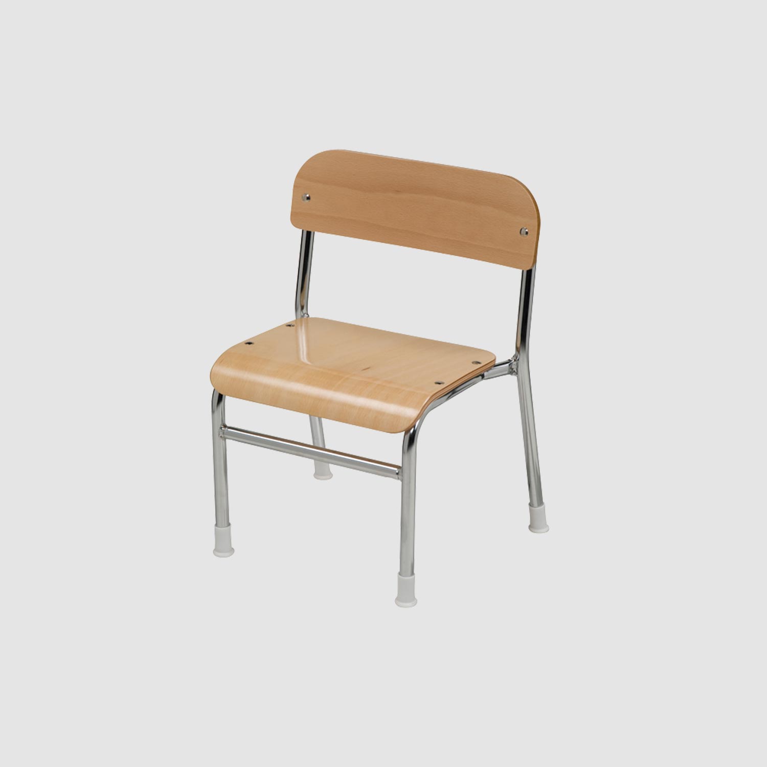 背部分に背板があるタイプのチェア。姿勢よく背筋を伸ばし、脚を床にしっかりつけて座る習慣を身に付けるために、乳児用のセレクトチェアに比べて座面幅や奥行が短くなっています。5脚までスタッキング可能です。