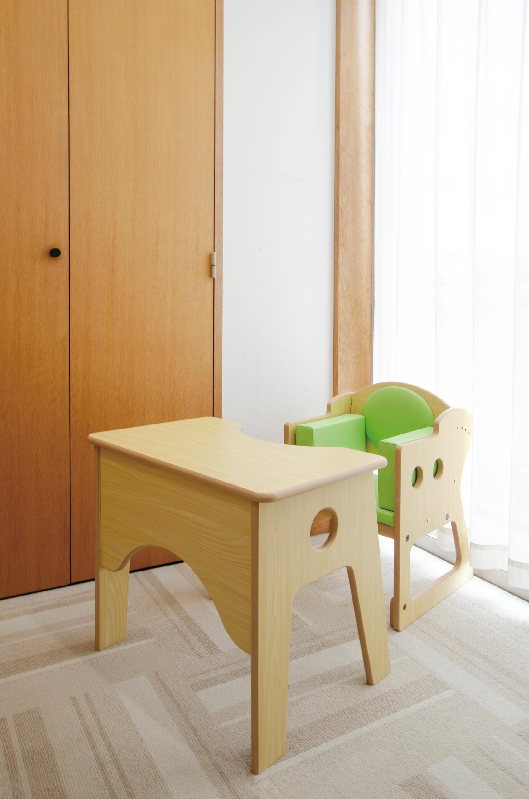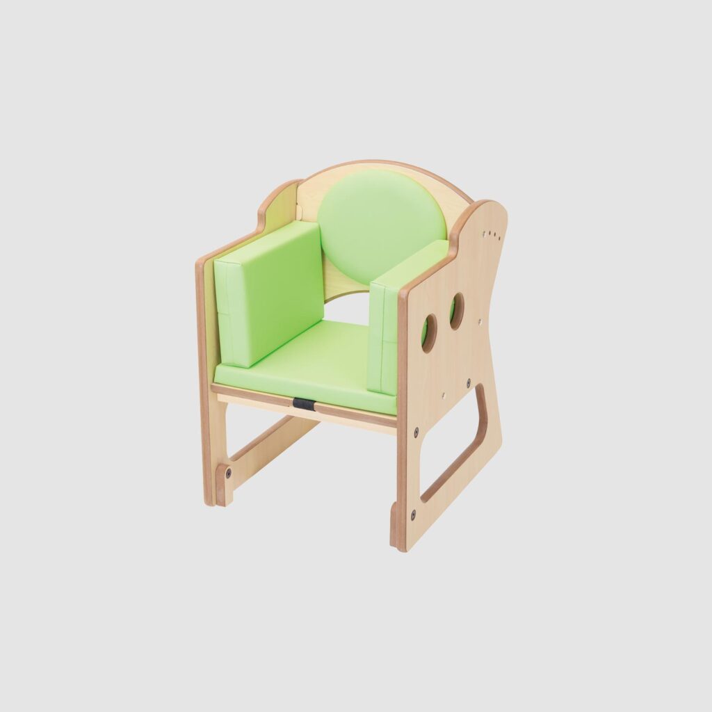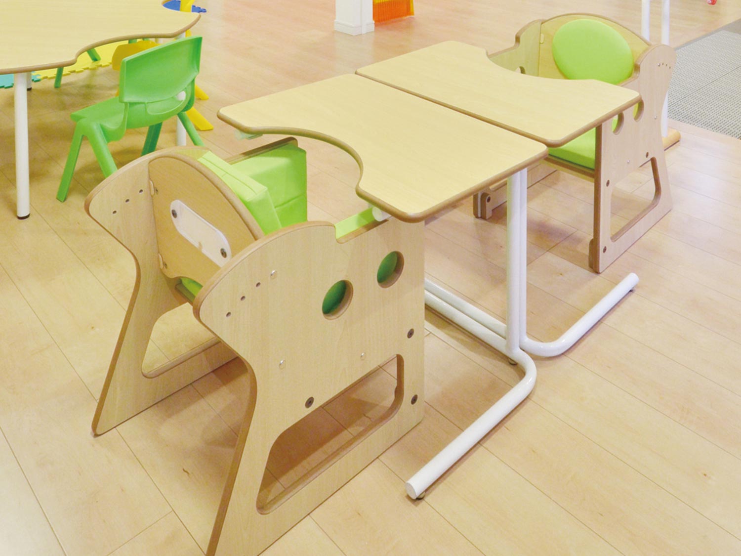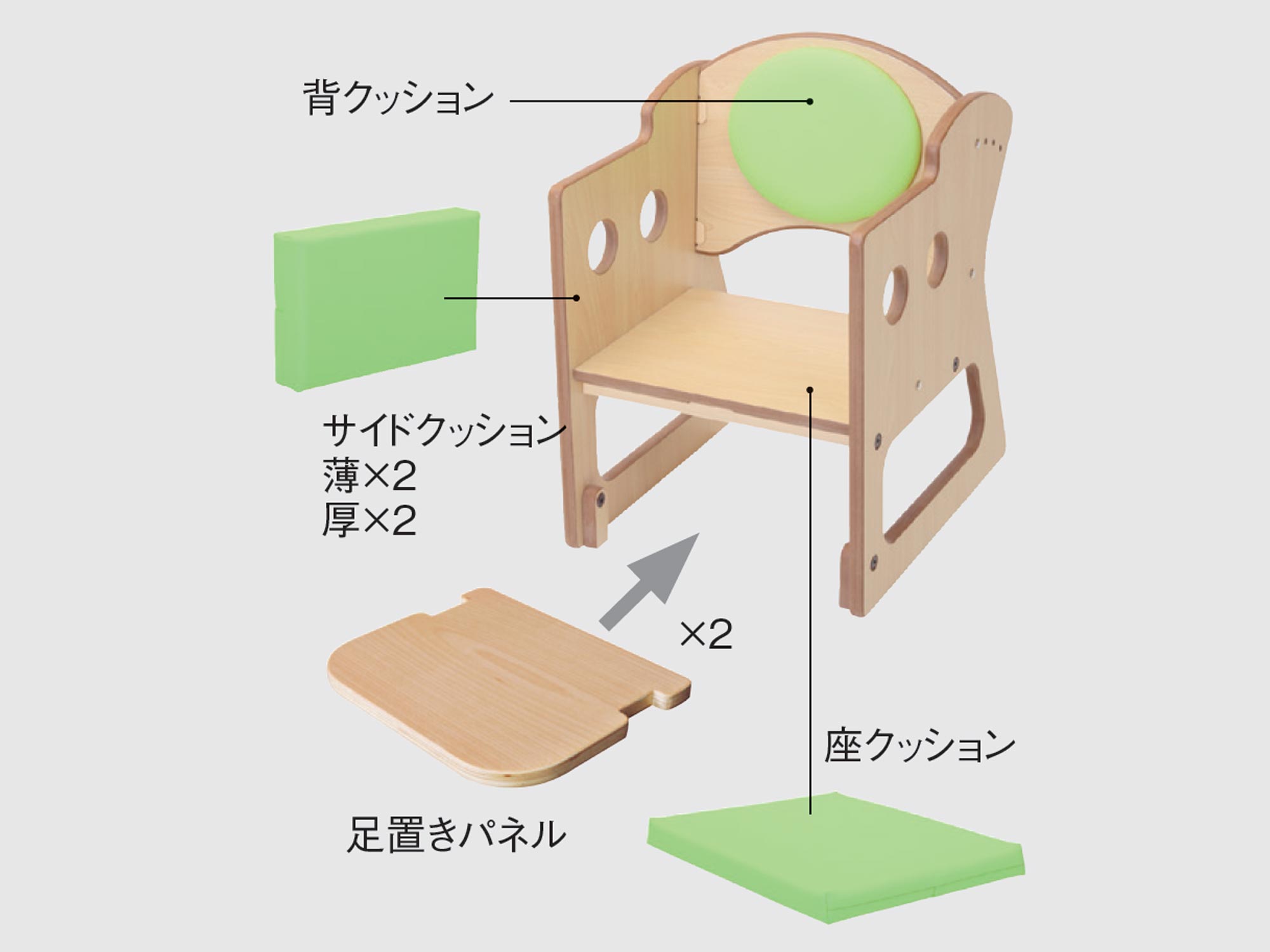サイドクッション、座クッションは取り外し可能。体格が小さくイスにフィットしない場合は、クッションを隙間に入れて姿勢をサポートします。足が床に着かない場合は足置きパネルを使用します。