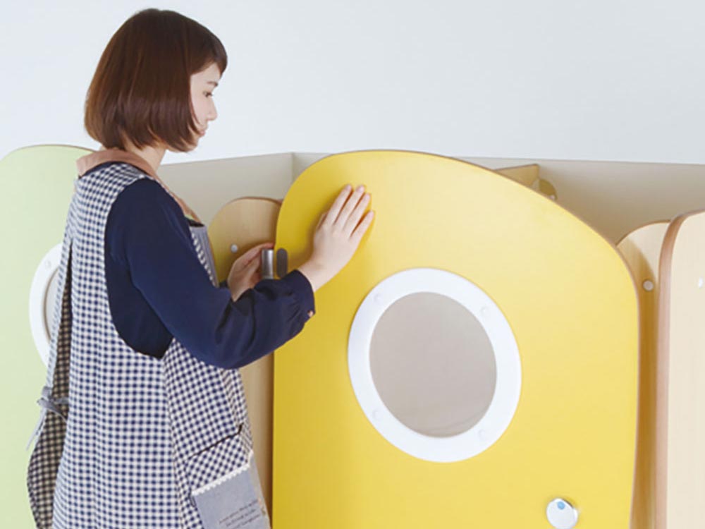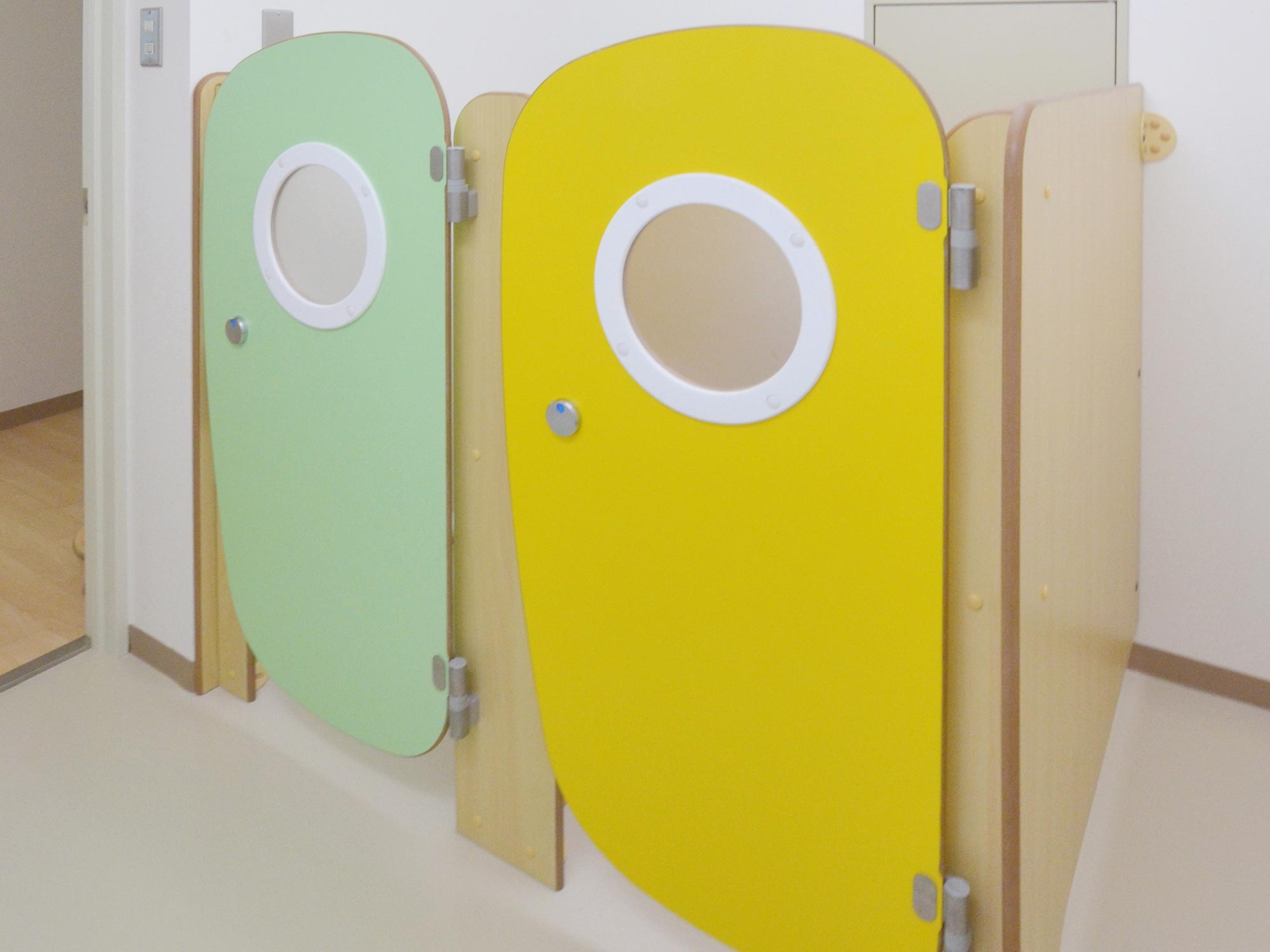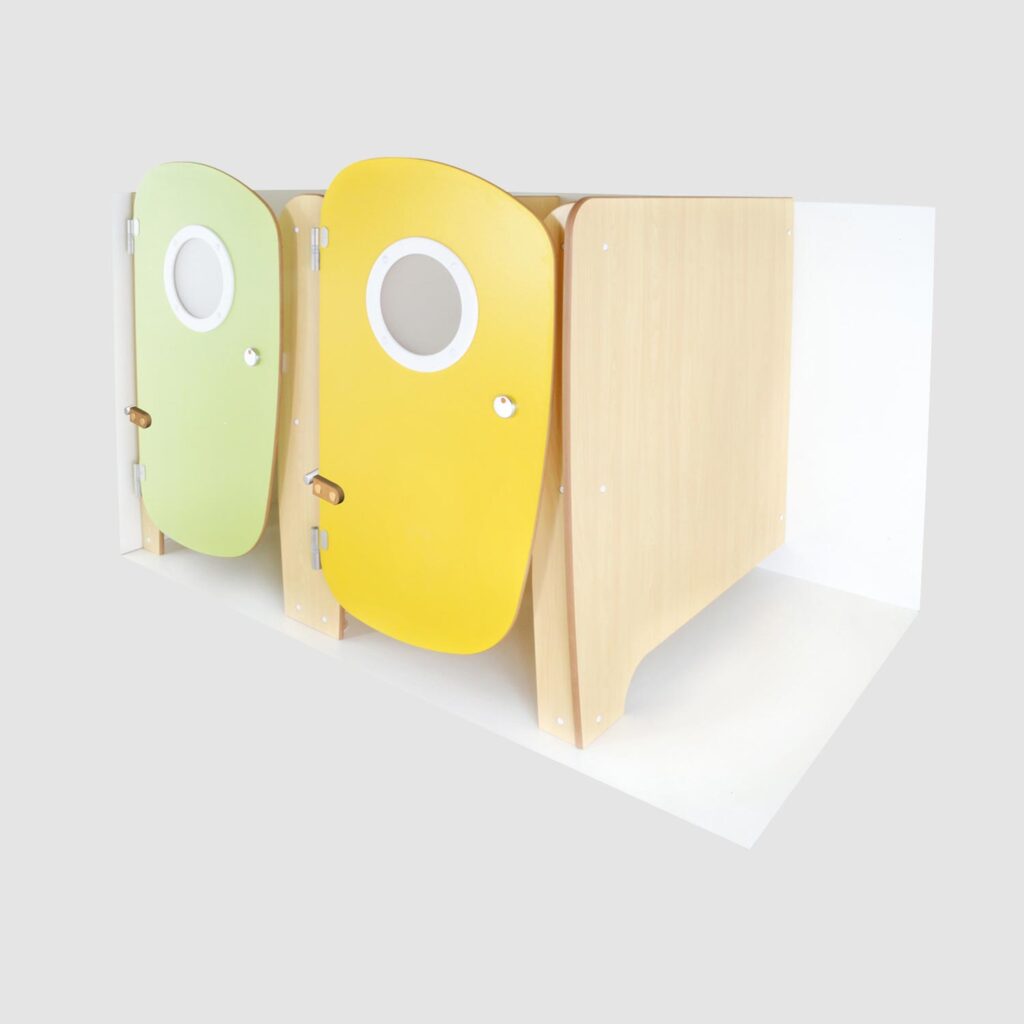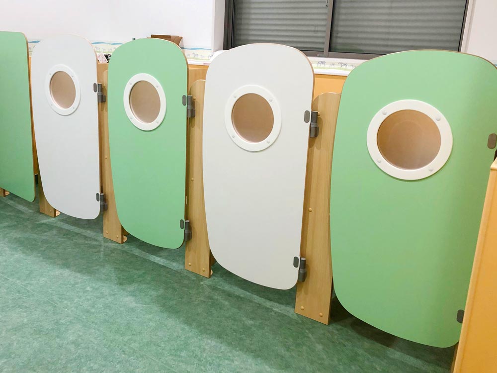 子どもたちが使いやすく、先生は見守りやすいトイレブースです。かわいらしいデザインでトイレスペースが楽しい雰囲気になります。扉は12色からお選びいただけます。設置場所に合わせた寸法での製作が可能。詳細はお問い合わせください。