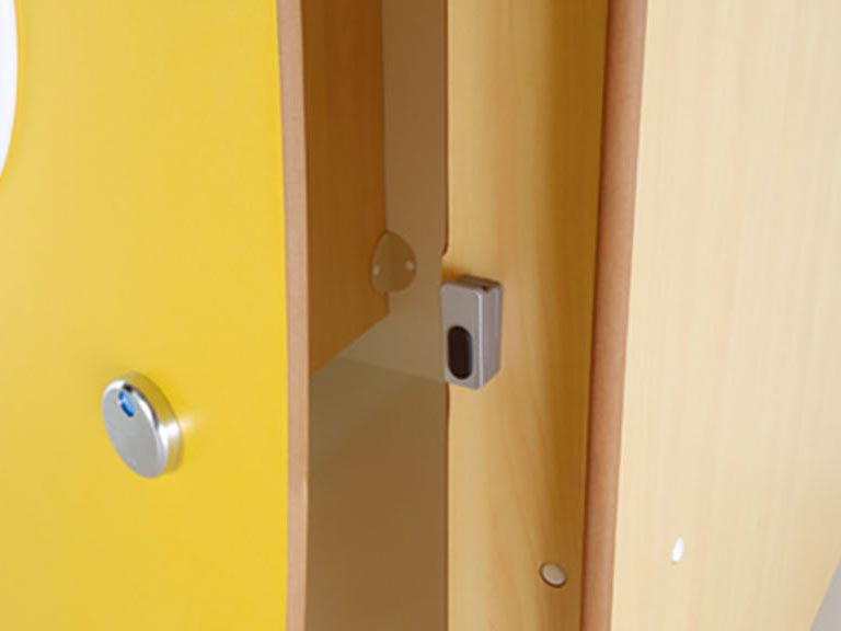 ブースの内側から鍵がかけられます。子どもが使いやすい、つまんで回すタイプの鍵です。開いていると「青」、閉まっていると「赤」の表示になり、ひと目で状況がわかります。