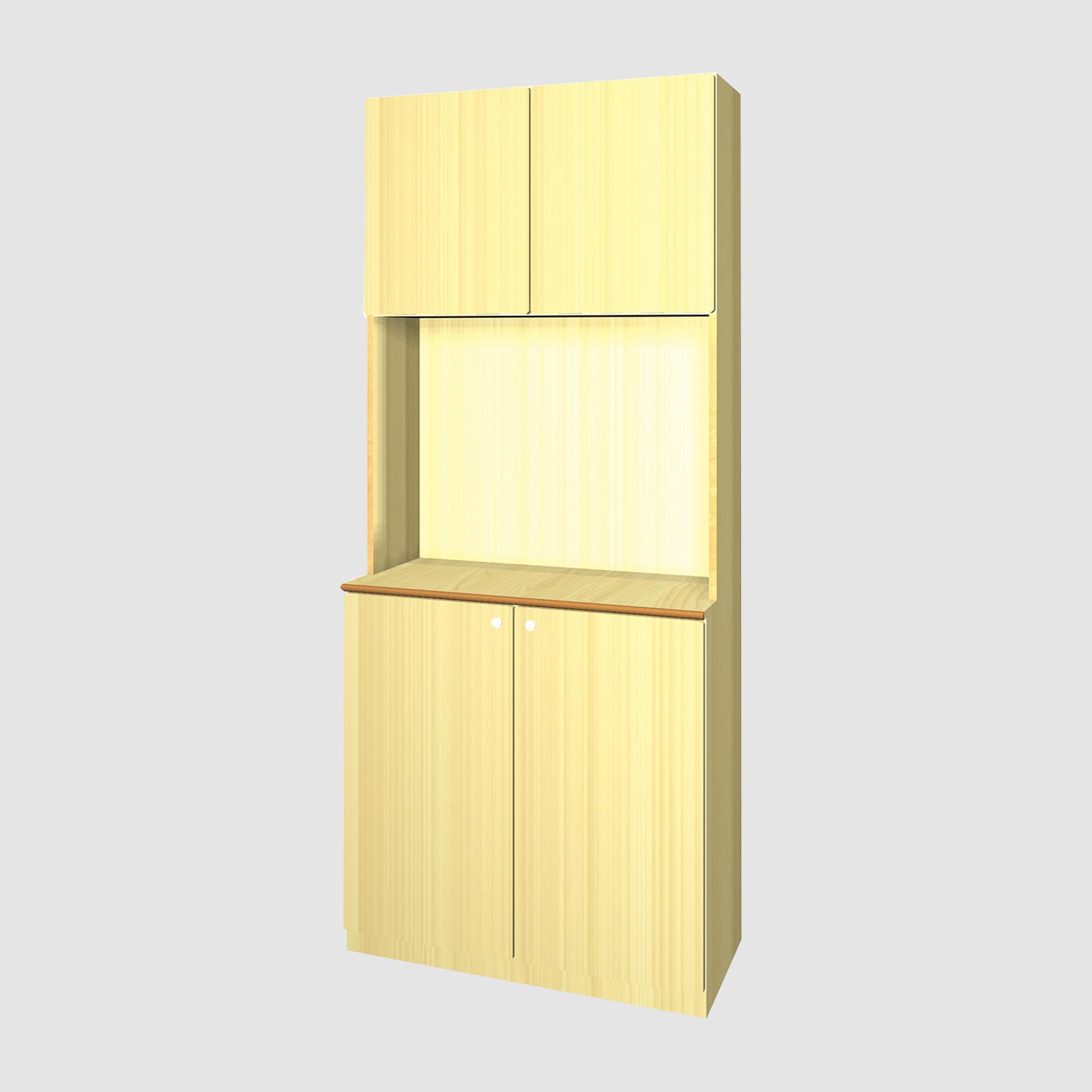 中段にポットや茶器を置いて使うことができます。接客用のコップなどは下段の扉付き収納棚に収納できるので便利です。