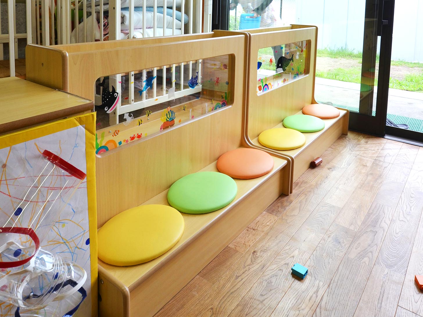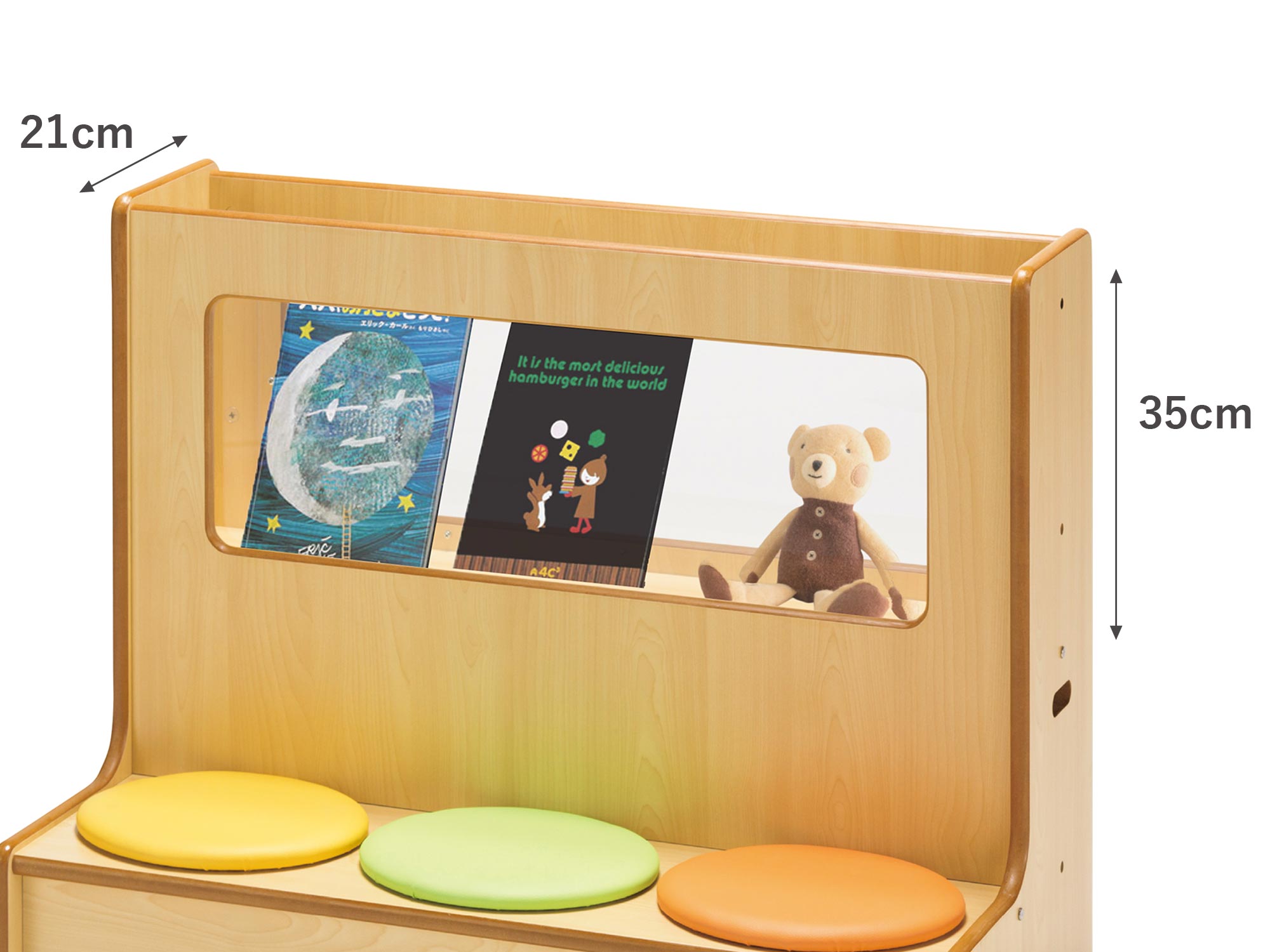 ボックスパーティション、パーティションベンチの窓付タイプは、展示スペースに絵本やぬいるぐみなどを飾ることができます。展示スペースの広さは幅90×奥行21×高さ35cm。季節の変化を感じるものや、行事に関するもの、子どもたちが興味のあるものを展示することで、覗いて楽しめるパーティションになります。