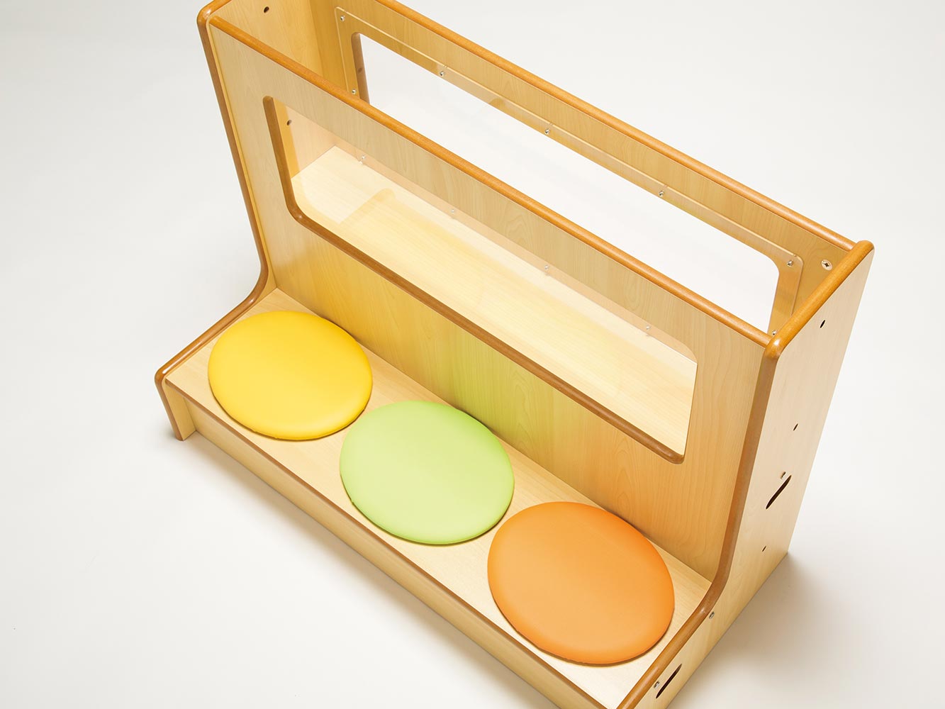 ベンチ型の窓付きタイプのパーティションです。窓部分に玩具や絵本を飾ることができます。季節や行事によって飾るものを変えることで、コーナーの雰囲気も変わります。トレーは付属しません。
