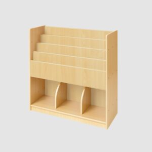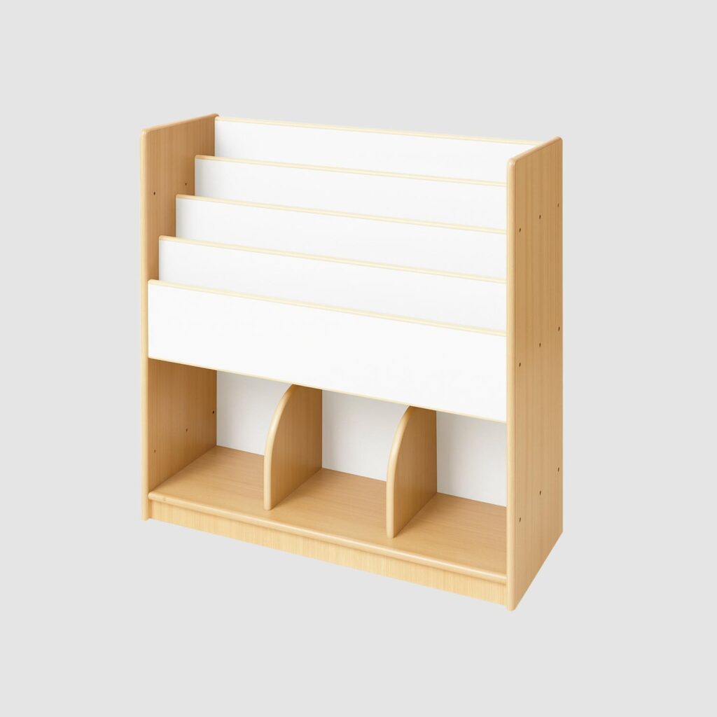 整理棚や絵本棚をぴったり連結できる収納棚シリーズに高さ 90cmタイプが登場しました。上段に展示できる面差し棚 、下段 に30冊ストックできる収納量のあるえほん棚で す。
