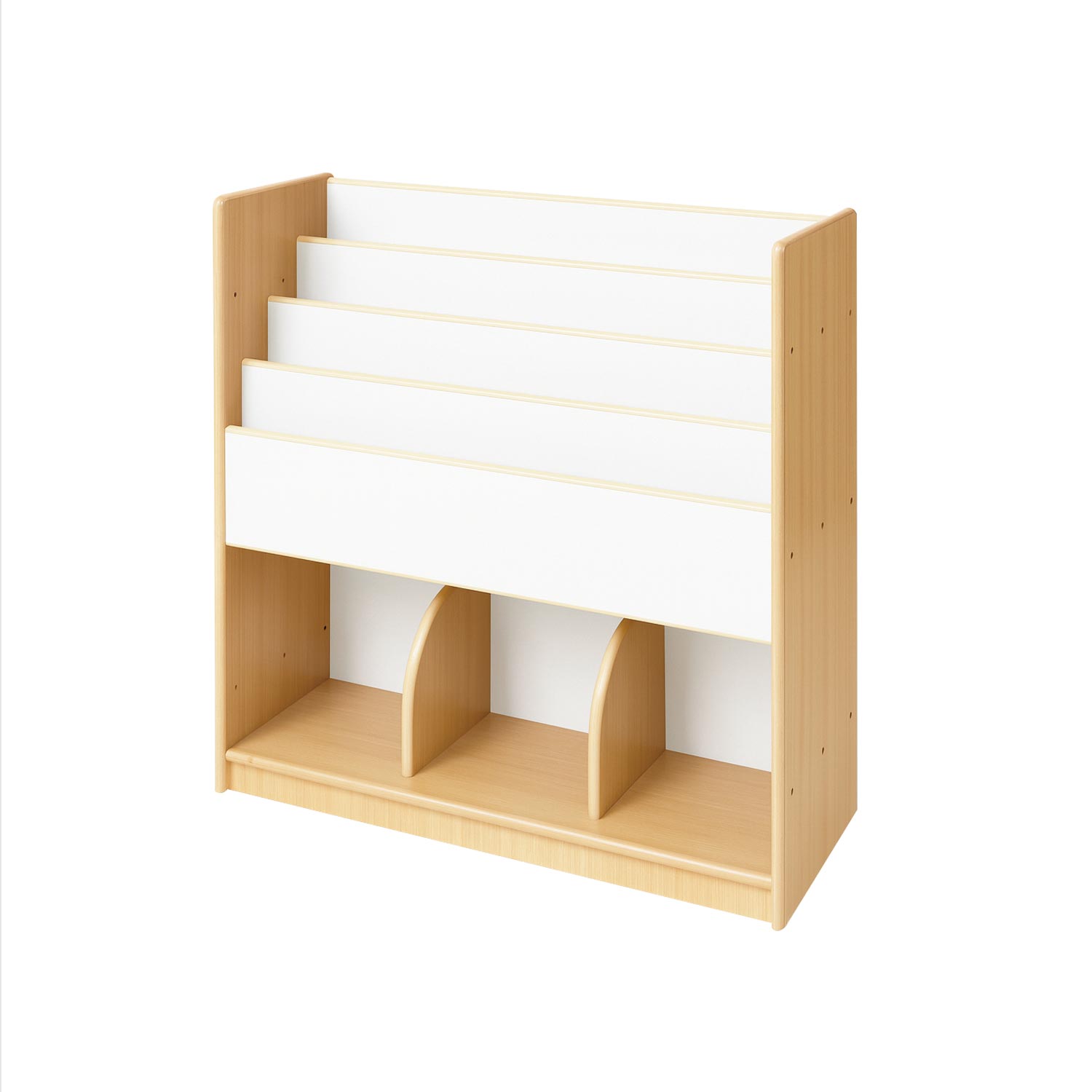 整理棚や絵本棚をぴったり連結できる収納棚シリーズに高さ 90cmタイプが登場しました。上段に展示できる面差し棚 、下段 に30冊ストックできる収納量のあるえほん棚で す。