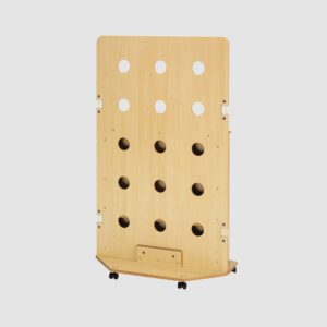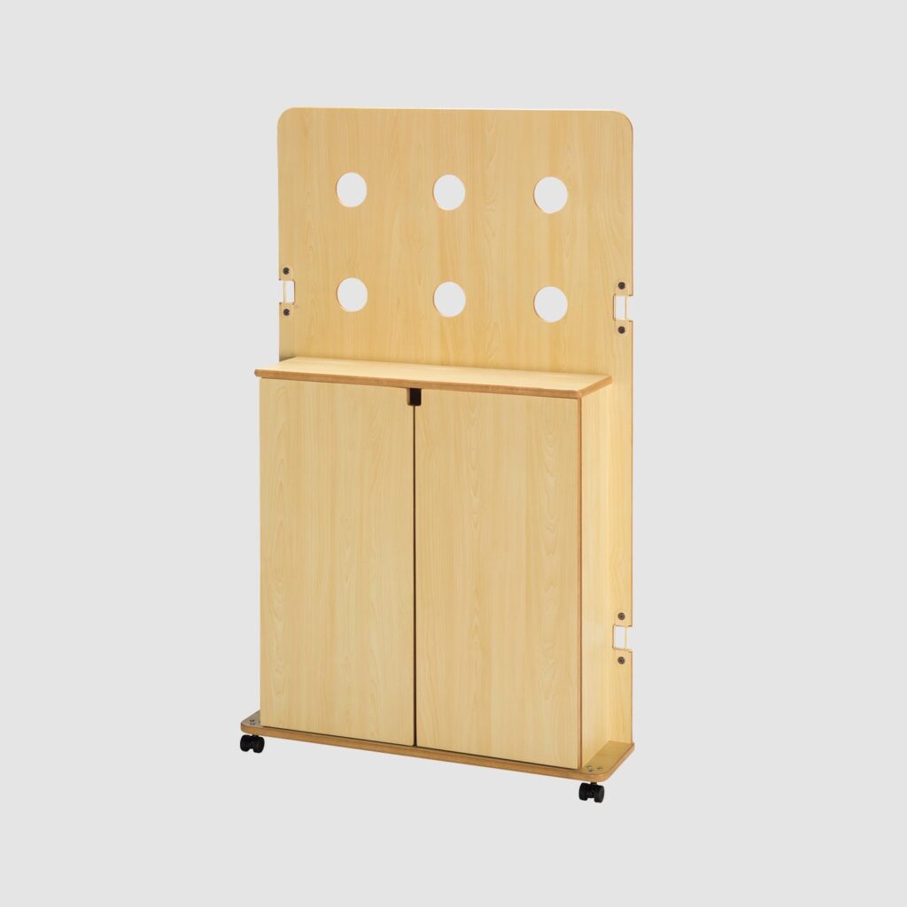 キャスターが付いていて移動が簡単な新しい発想のパーティションです。高さがあり連結も簡単なので、工夫次第で簡易倉庫やステージ、作品展示スペースなどになります。ボックス付きパネルは収納スペースがあり、収納棚の天板にはおたよりなどを置くこともできます。