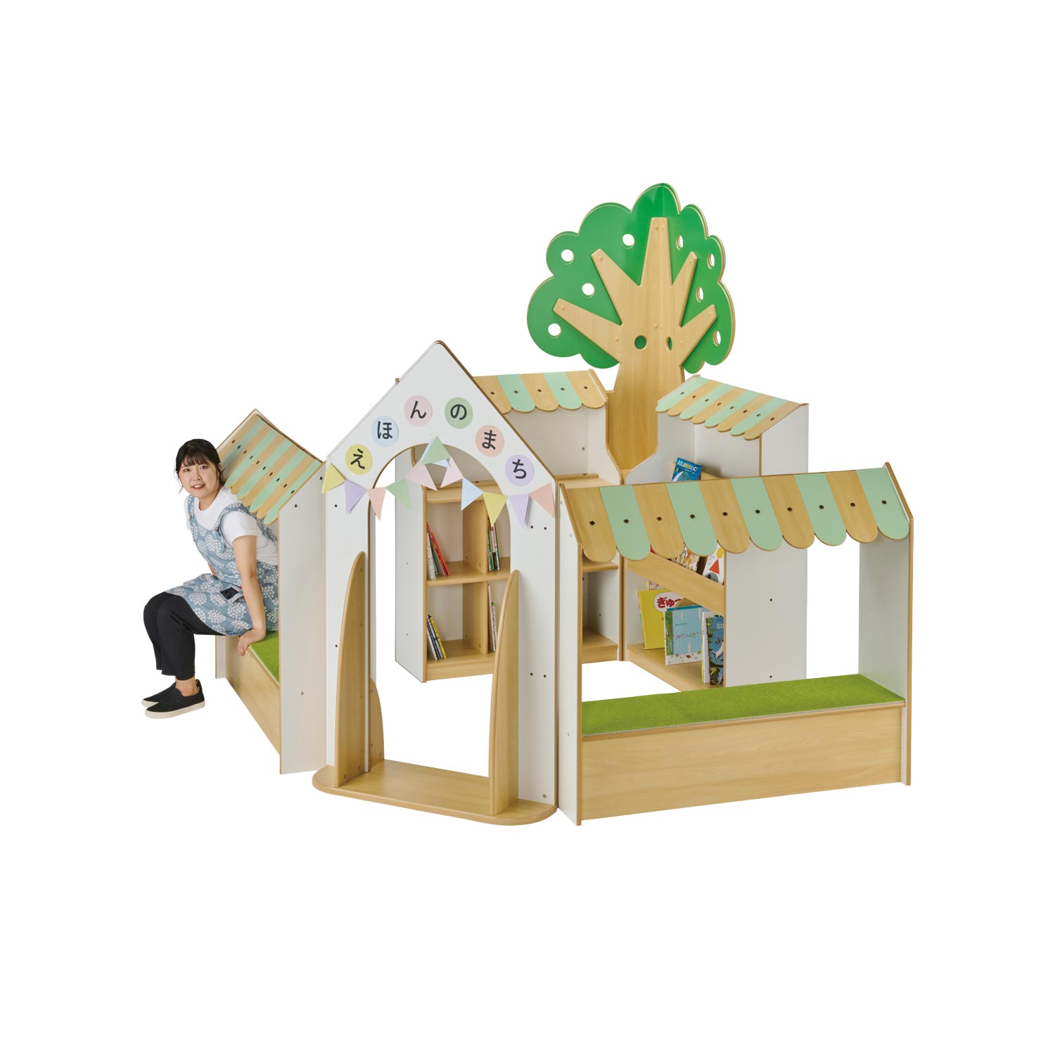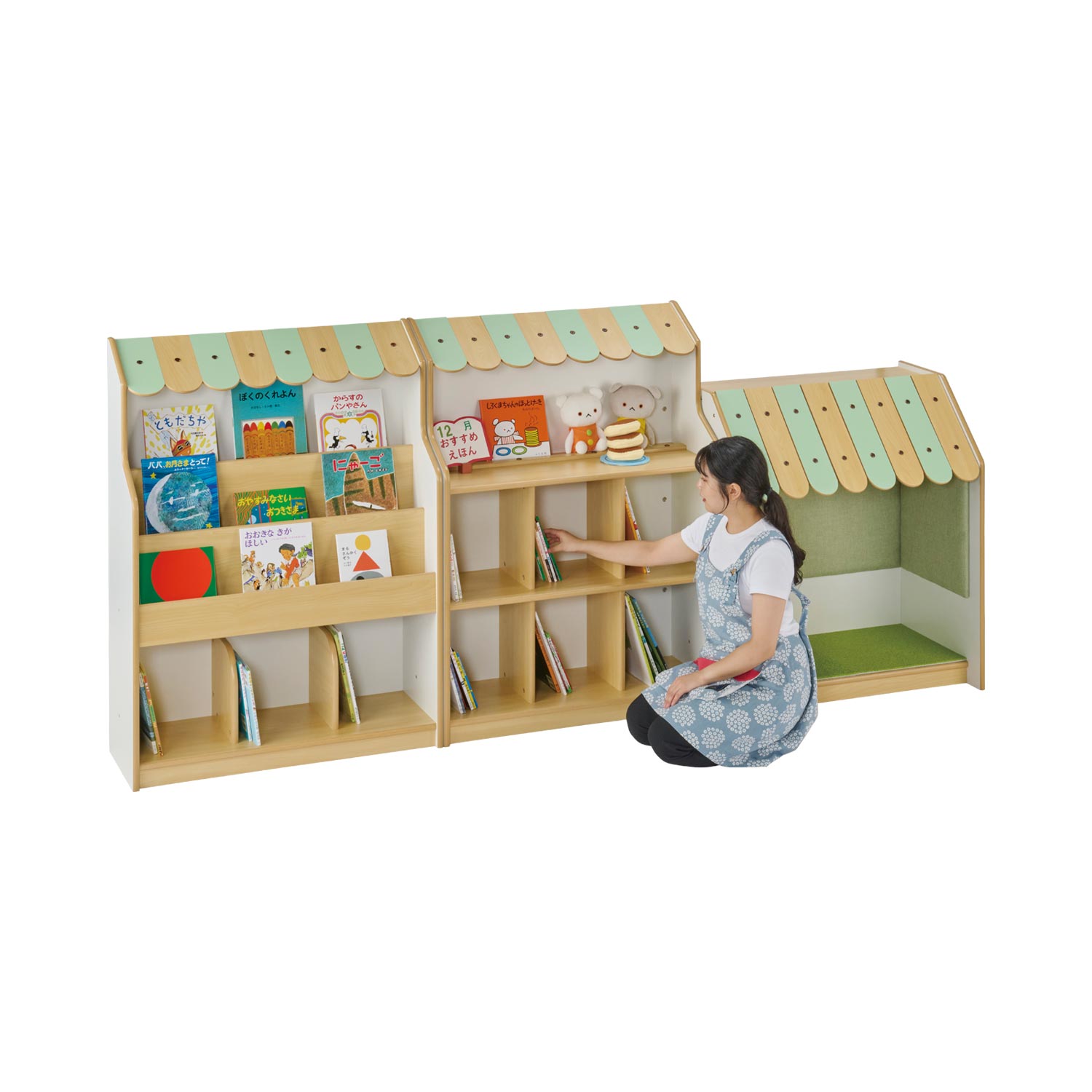育室や、エントランス、廊下など、スペースに合わせて展開できるえほんマルシェシリーズ。かわいらしい屋根が楽しい雰囲気を演出します。さまざまなタイプの絵本棚を自由に組み合わせて園にぴったりのスペースをつくりましょう。