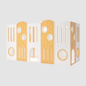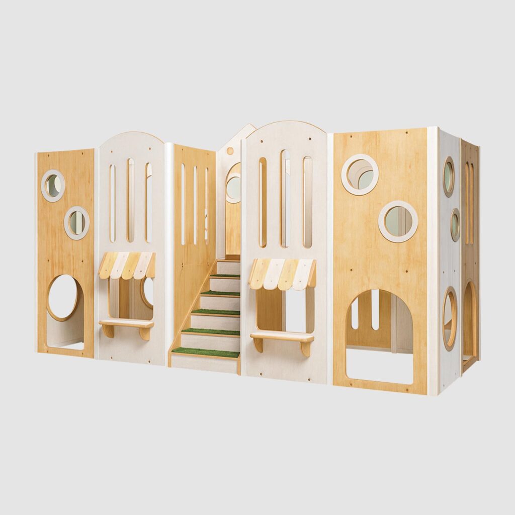 幅4.6mの存在感のある大きいロフト。階段を上ると左右にそれぞれ空間が広がっています。友だちとお喋りできるスペースにしたり、落ち着いて絵本を読む空間にしたり、空間の活用方法はさまざま。下段にはカウンターテーブルがあり、お店屋さんごっこをすることができます。色や形など、ご要望に合わせてデザインすることも可能です。
