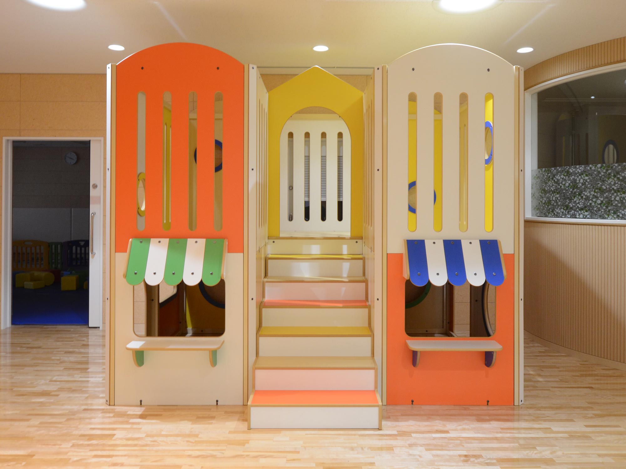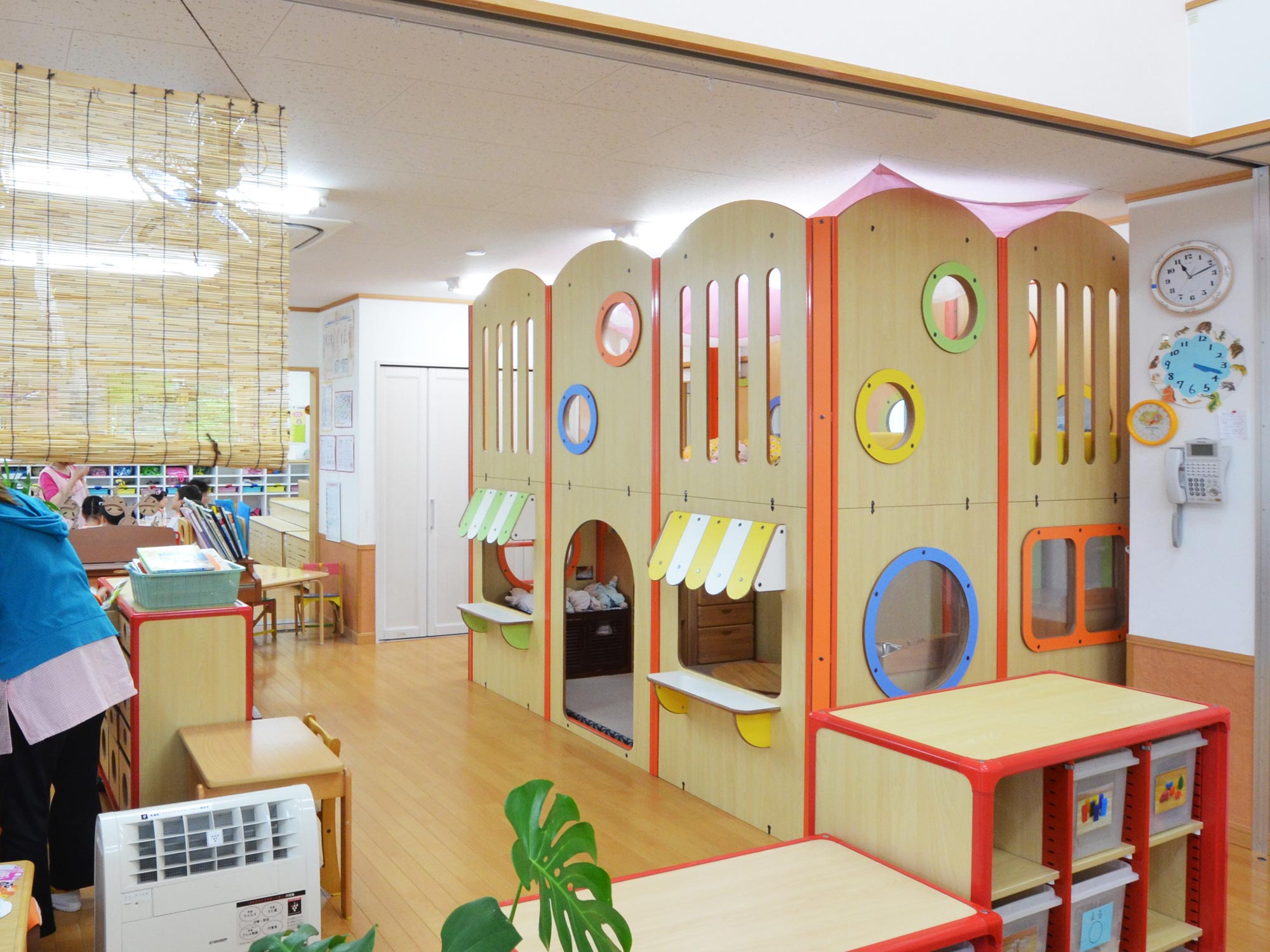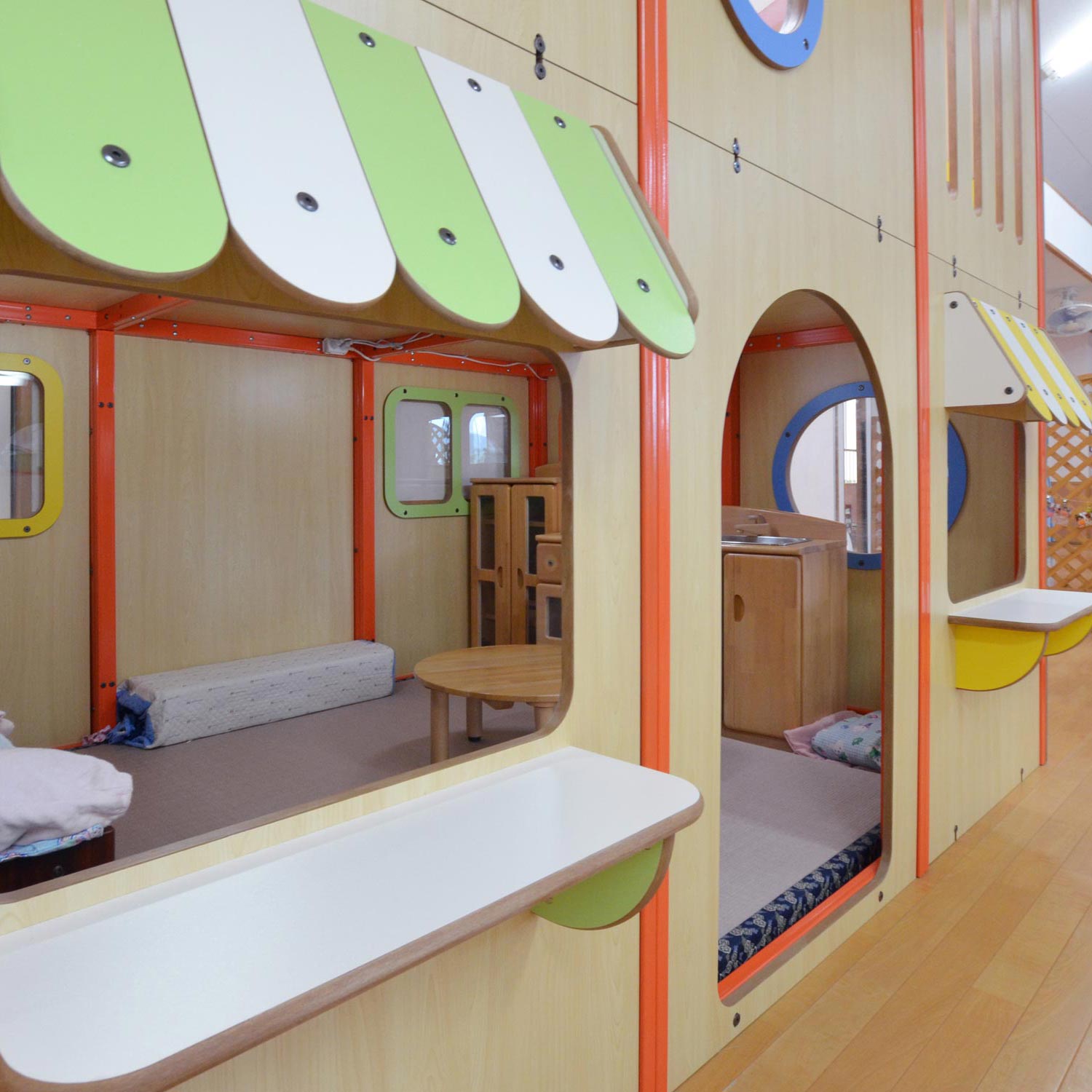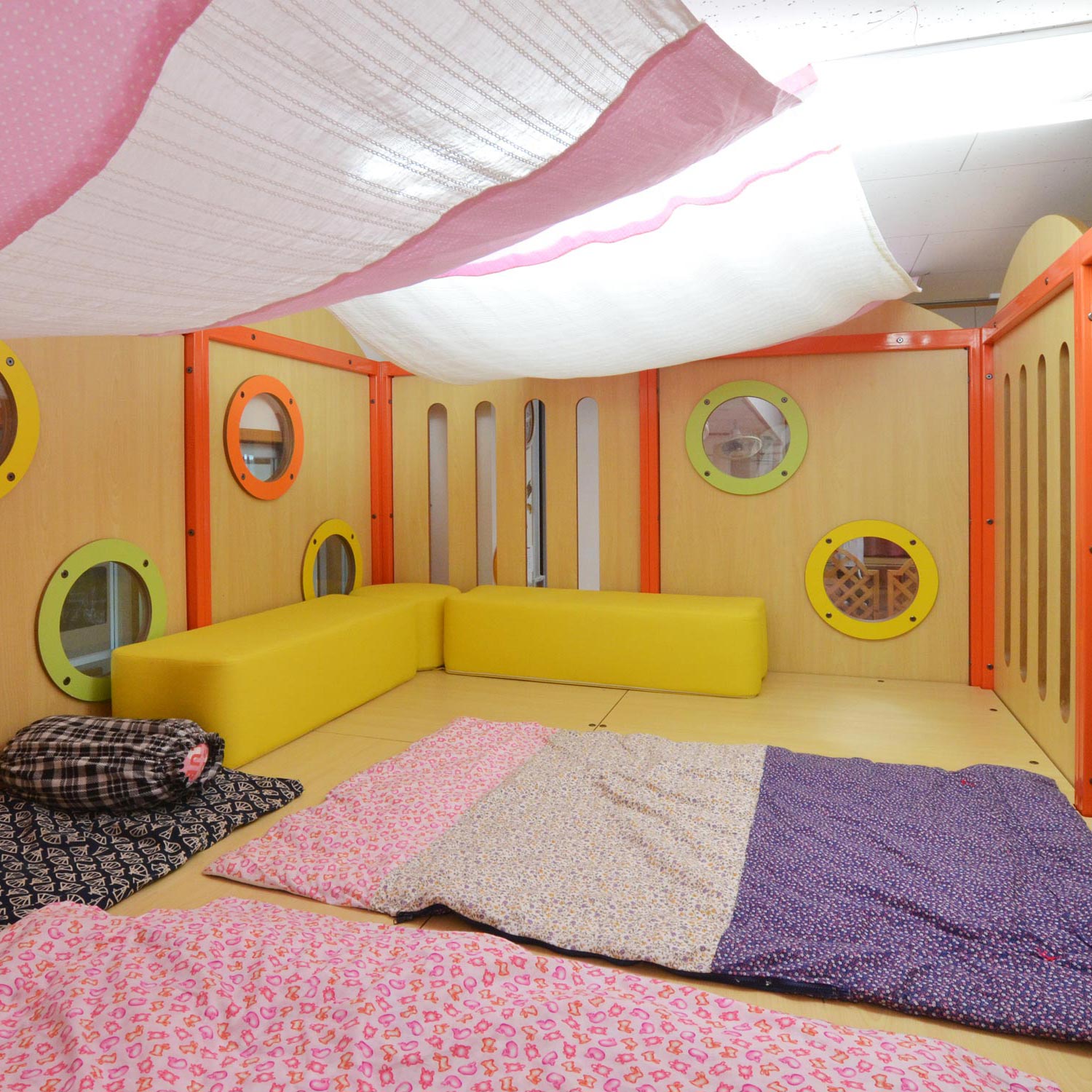 2階は遊べる空間、1階は広い収納スペースになっています。1階の収納スペースにはワゴンを使ってコットや布団を収納。扉があるので、普段は中が見えずすっきり。おひるねの時間帯、保育室のレイアウト変更を際にすぐに取り出せるので便利です。