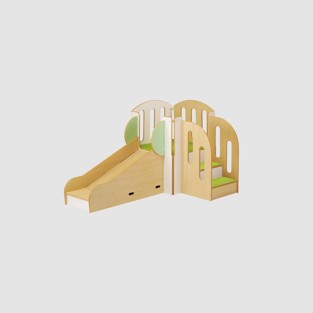 乳児の室内運動にぴったりなコンパクトサイズのロフトです。すべり台や階段などのユニットを自由に組み替えられるので、成長に合わせて遊び方を変えることができます。戸外活動が難しい、雨天時にも活躍します。