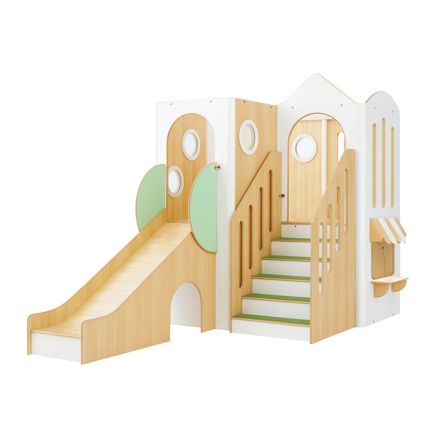 すべり台が付いたロフトです。階段をのぼったり、すべり台の下を通りぬけたり、運動遊具としてもお使いいただけます。