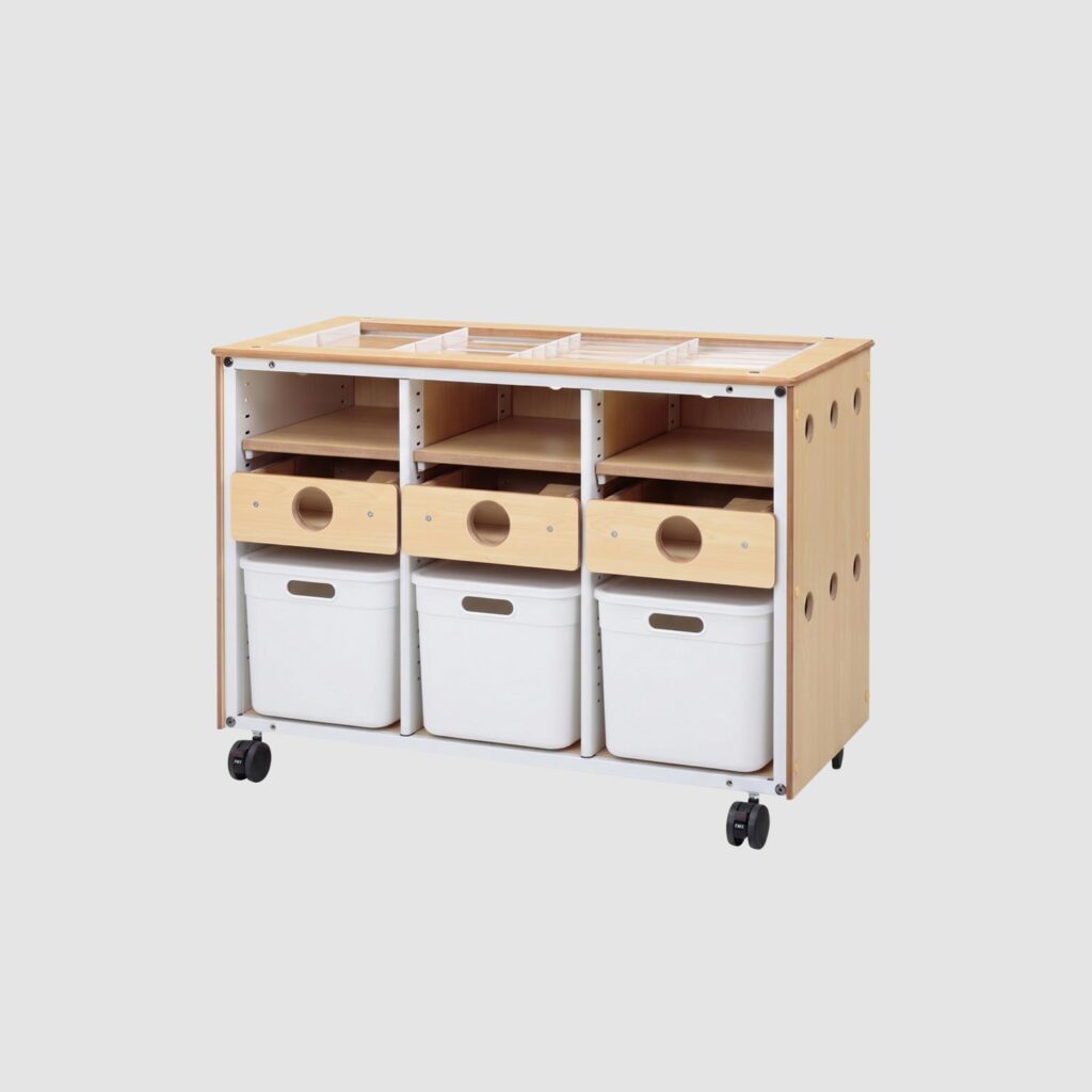 子どもが自分で選べるように制作道具を収納するワゴンです。上段には色鉛筆やハサミ、中段・下段には制作に使う材料を収納できます。