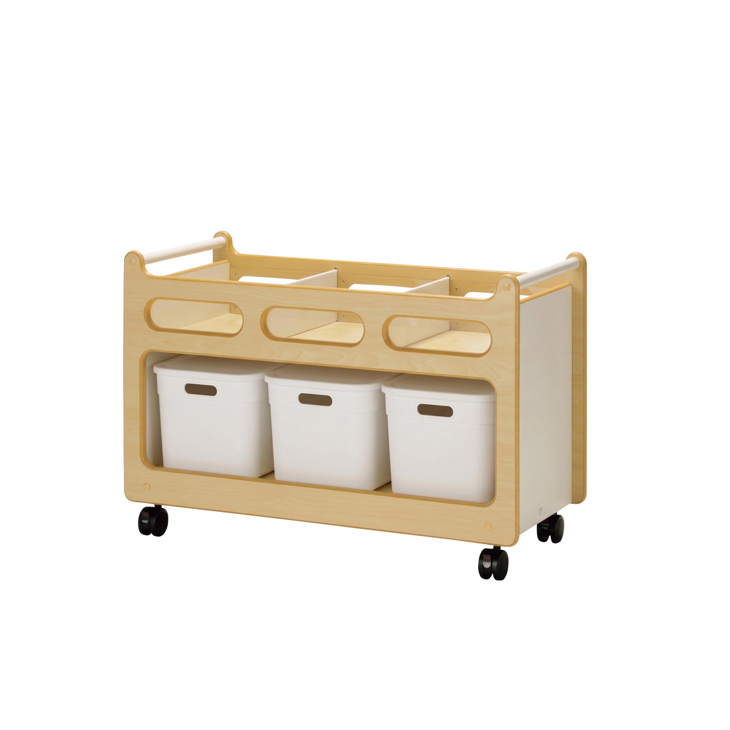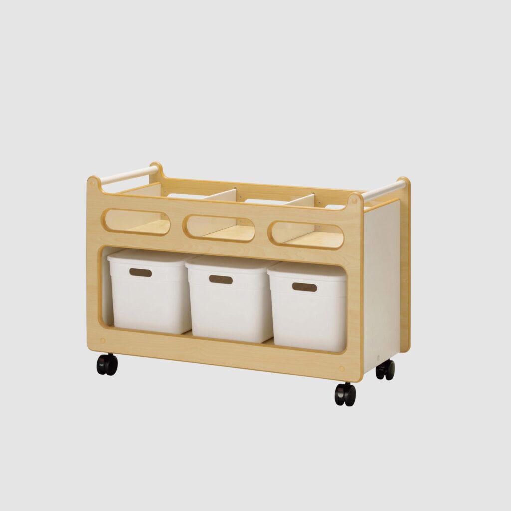 左右どちらからも玩具を取り出せるつくりな上、キャスターにはストッパーが付いているので、壁に沿わずコーナーの真ん中に置いて使うことができます。広いスペースを必要とするブロック・つみきコーナーの仕切りとして便利です。