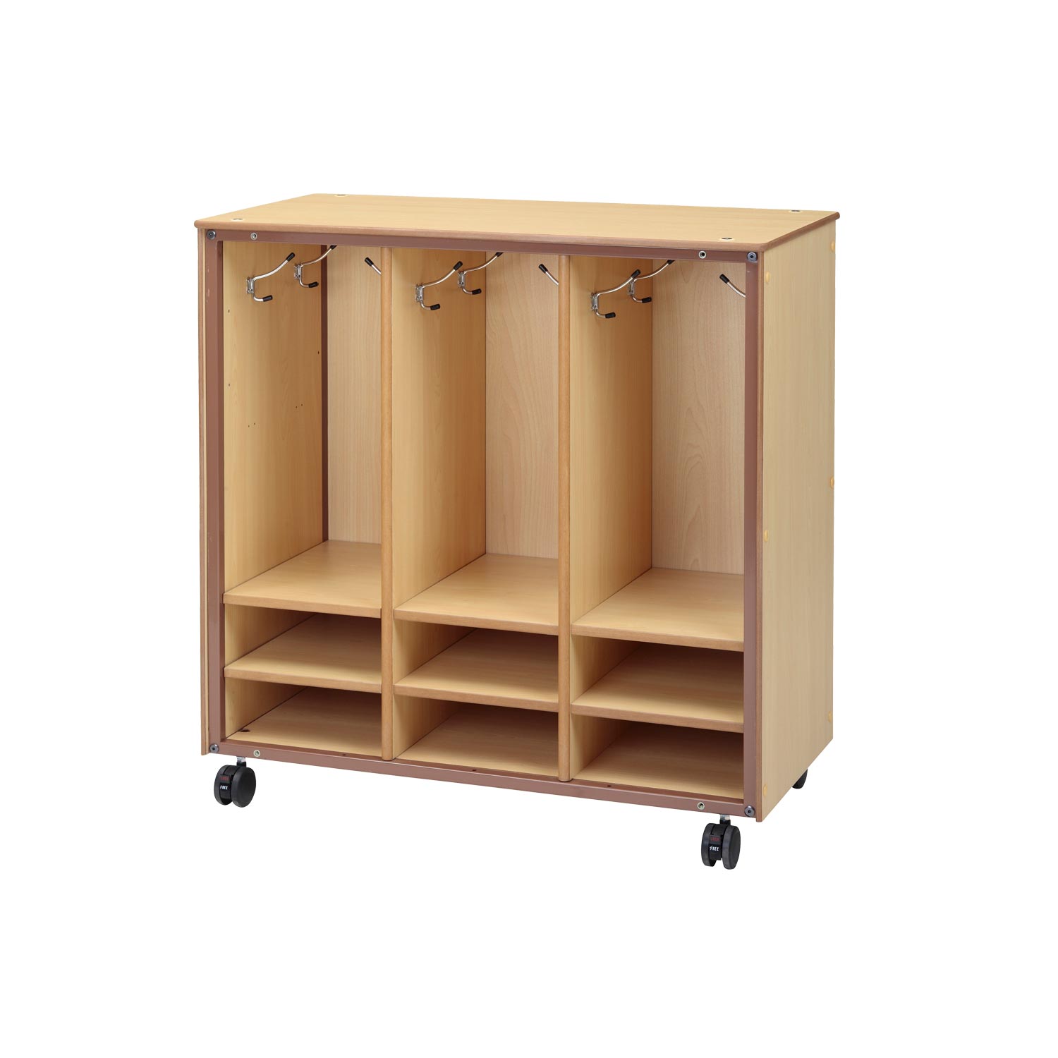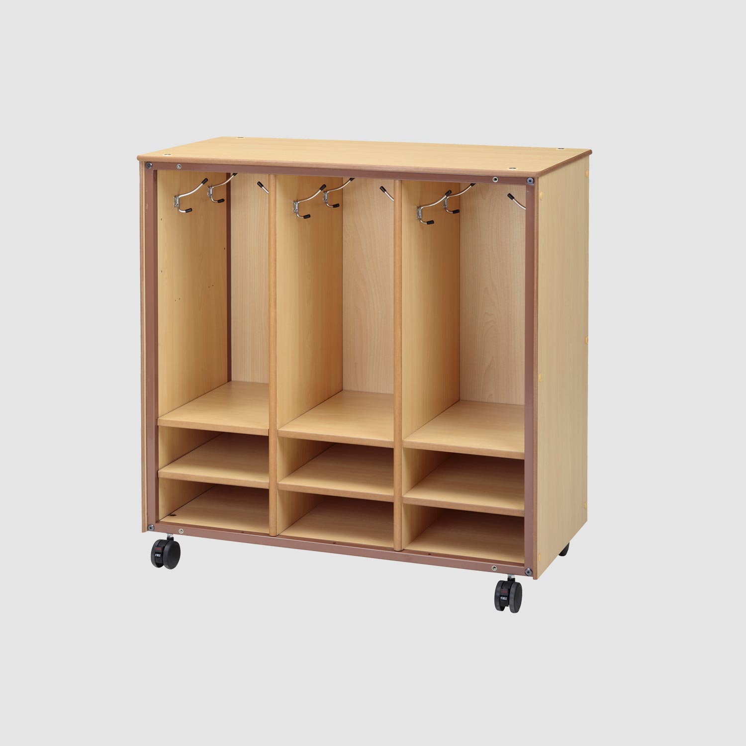 上着・帽子などが掛けられるフックがあり、収納スペースが棚板で仕切られています。6人用・3人用としてお使いいただけます。