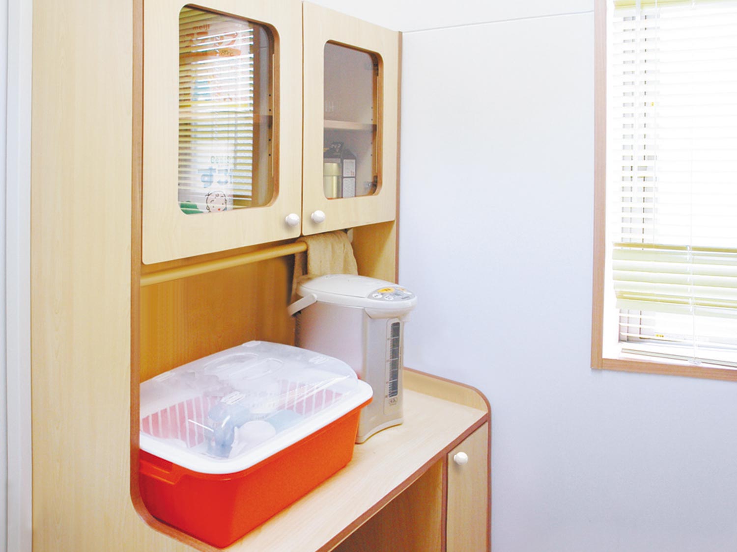エプロン、ミルク缶、哺乳瓶保管庫、ポットなど、置くものがたくさんある調乳スペース。収納棚の他に、フックを掛けるパイプや、引出し、高さのある収納スペースが備わっています。