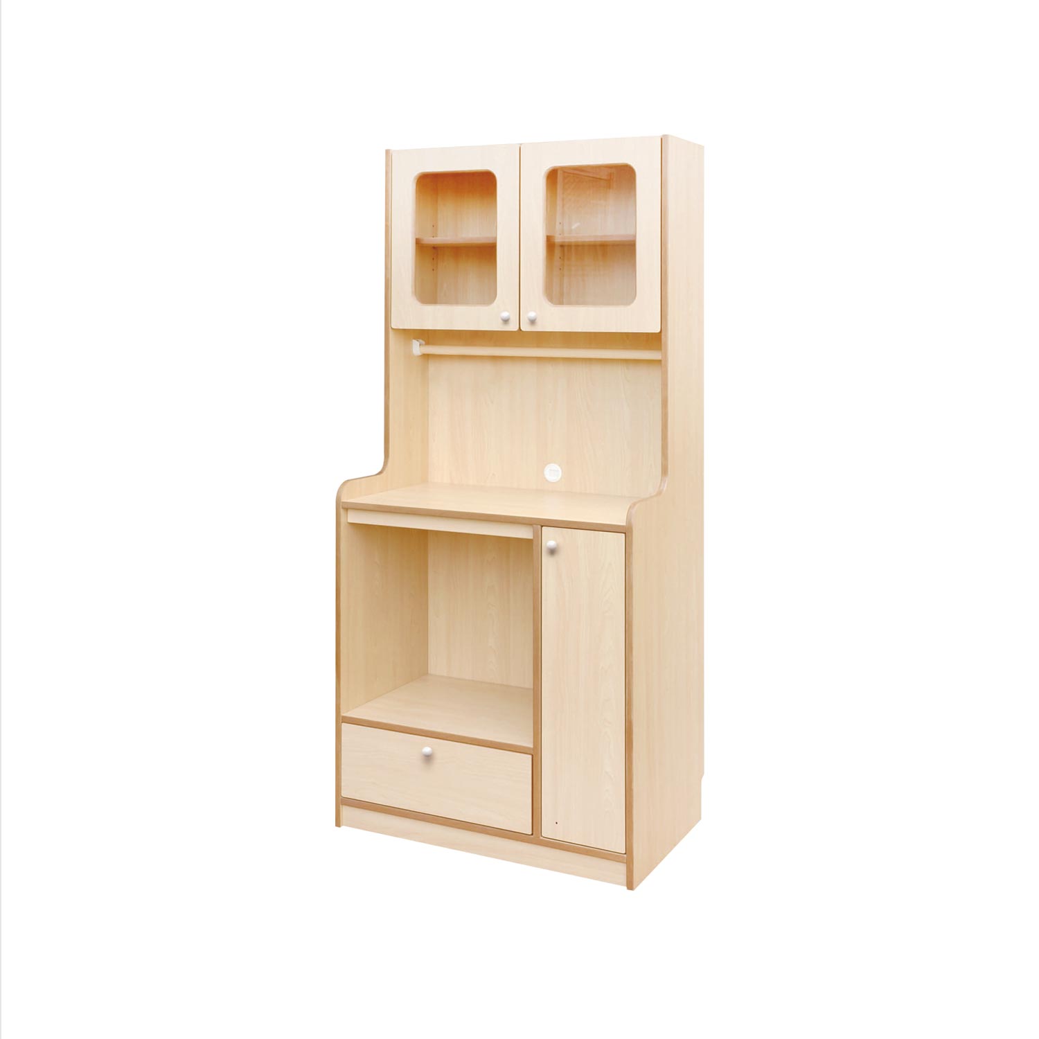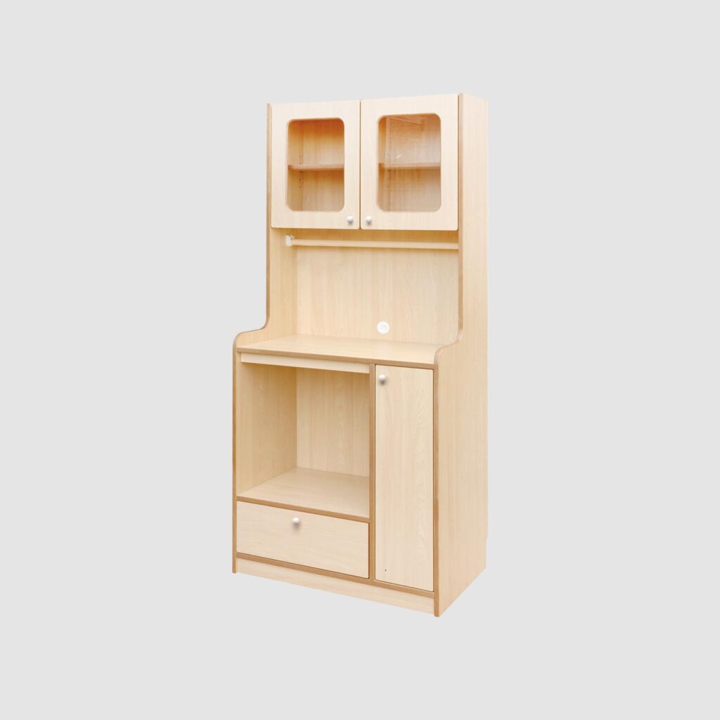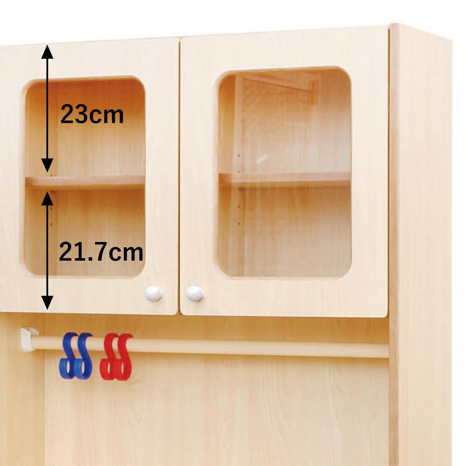 上段はアクリル窓付きの収納棚です。中身が見え、2段にわかれています。中段は幅が広いので、場所をとる哺乳瓶保管庫などを置くのに最適です。下段にある縦型の収納スペースは扉を開けと棚板があり3段にわかれています。