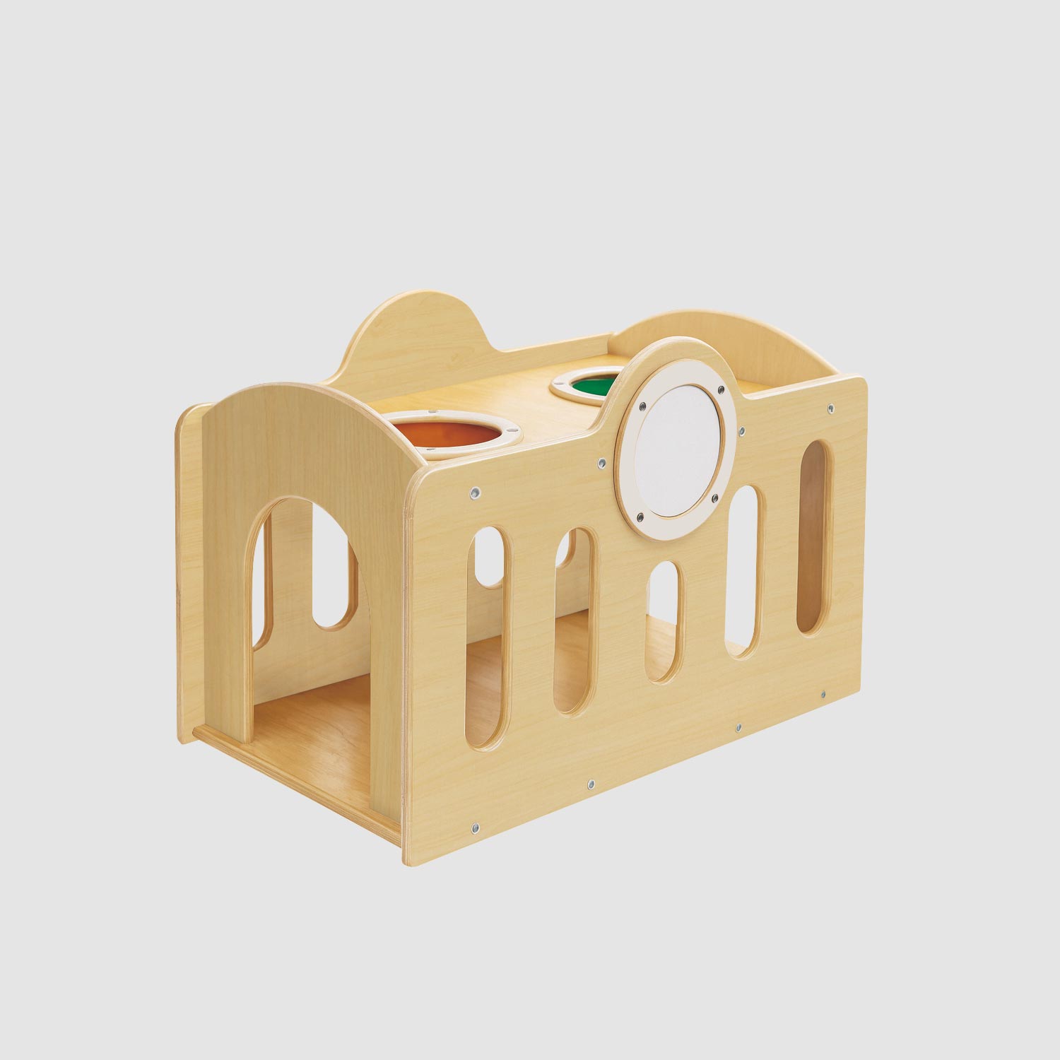はいはいができるようになった子どもがくぐって遊ぶトンネルです。両側面にはスリットがあるので中からでも外が見えて圧迫感や閉鎖感がありません。上面には赤と緑のアクリル窓があります。
