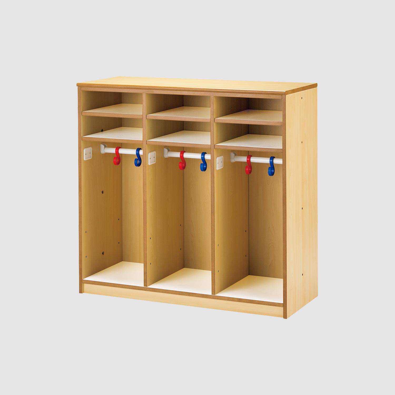 1枠に2人分の荷物を収納できるつくりになっているので、6人分のロッカーとして使えます。棚部分には道具箱や衣服を、フック部分にはかばんを掛けて使います。