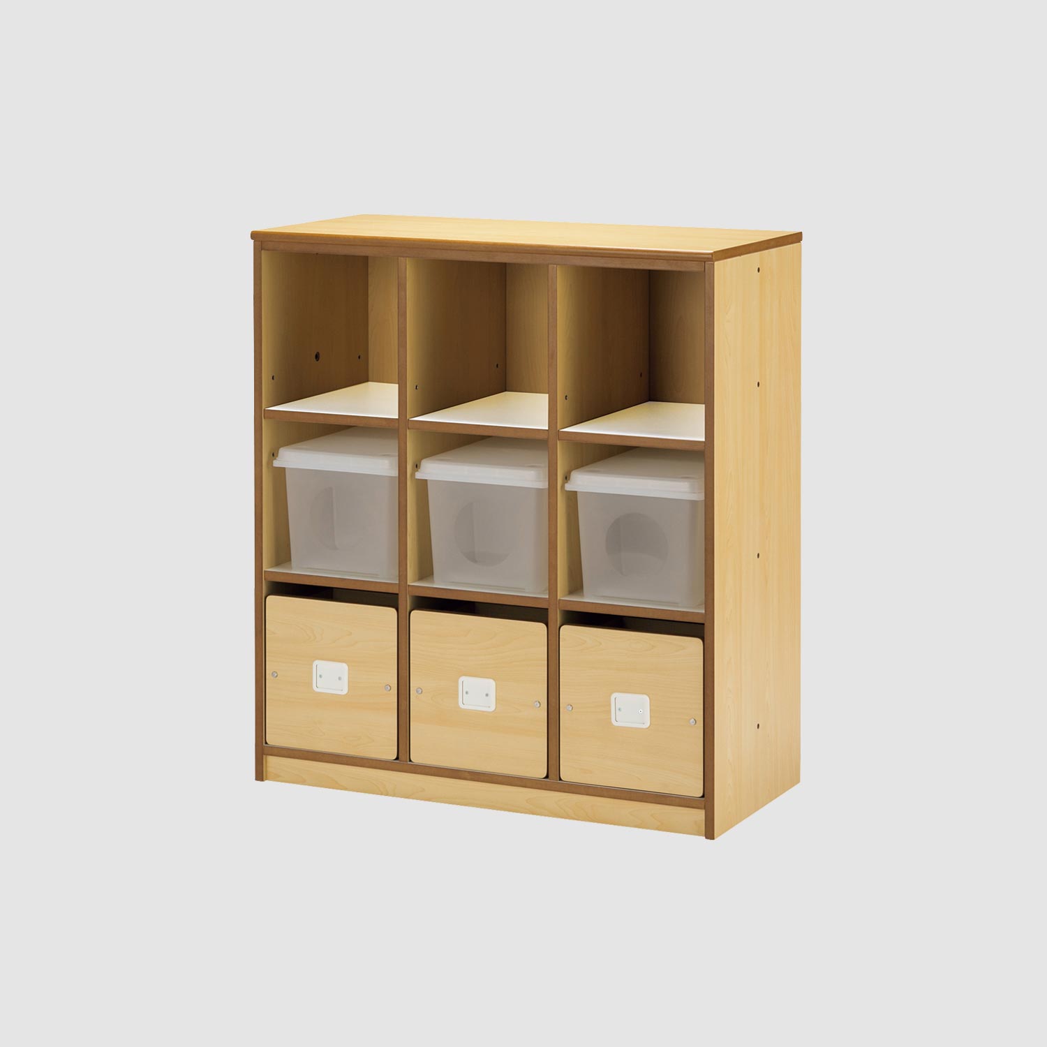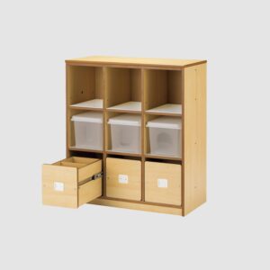 標準カラーはナチュラル木目ですが、板材の部分は全て色変更可能です。保育室の雰囲気に合わせた色にしたり、クラスごとに色をわけることもできます。また幅、奥行、高さはもちろん、棚板の位置、引出しのサイズなど、ご要望に合わせた形にカスタマイズすることができます。