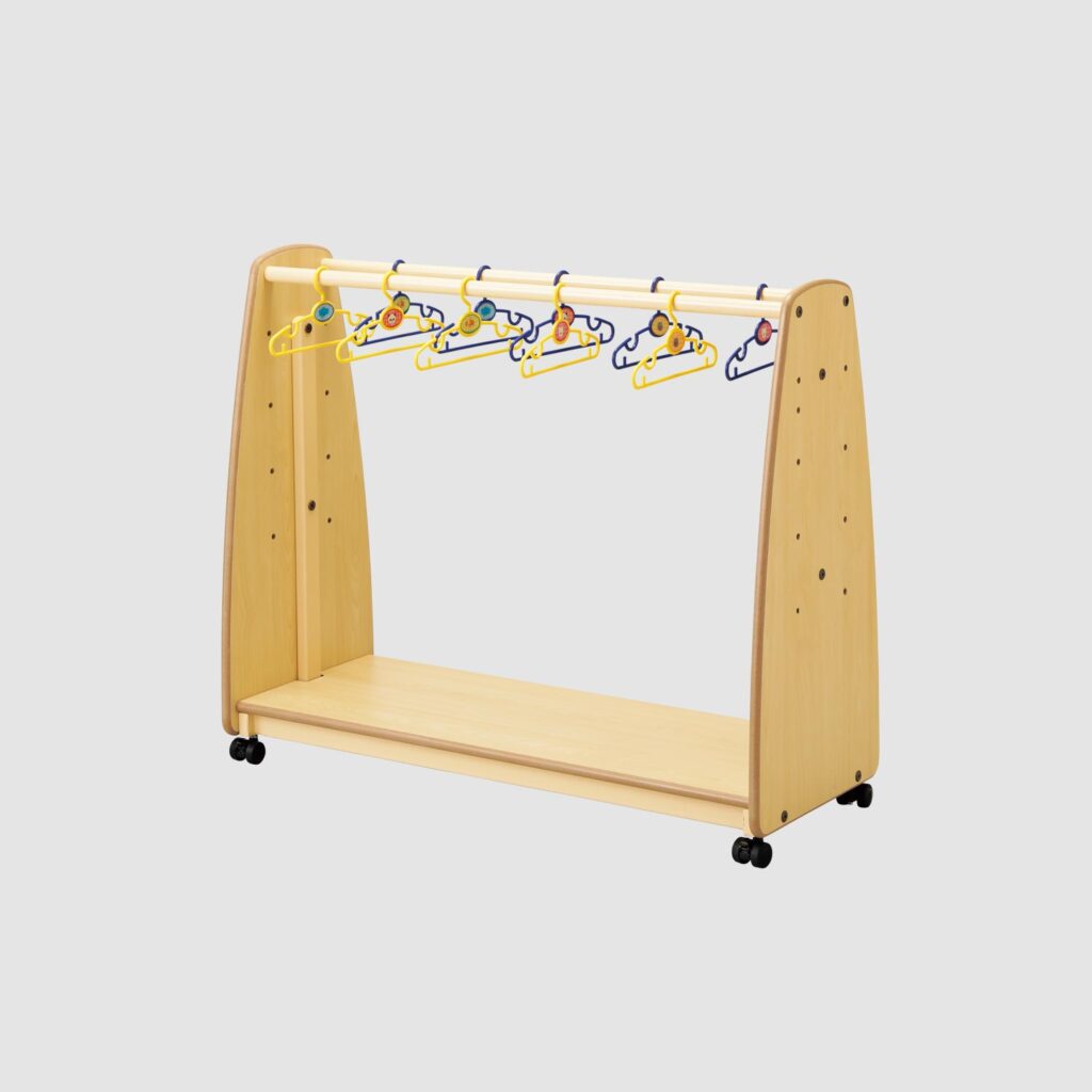 かばんや水筒を掛けて管理するワゴンです。キャスター仕様で移動が簡単。基本セットにはフックなどが付属していないので、使い方に合わせてオプションをカスタムできます。