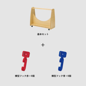 使い方が選べるワゴン[基本セット]に横型フック赤×6個、横型フック青×6個が付属したシンプルなかばん掛けセットです。フックには顔写真やイラストが差し込めるので誰のものか一目でわかり、かばんの取り違いを防ぎます。