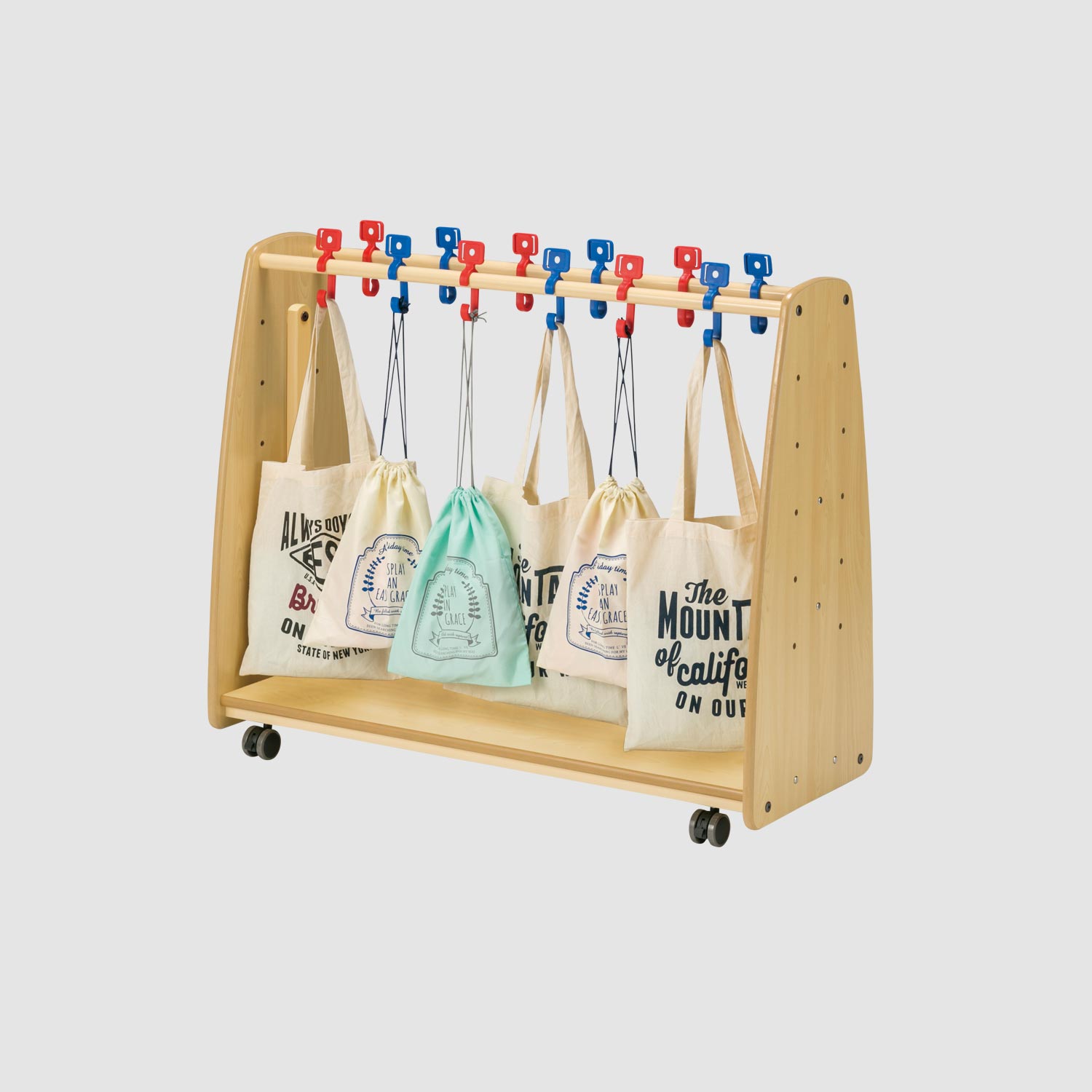 登降園バッグやプールバッグ、防寒具などを掛けます。顔写真の入る横型フックを使うことで、どれが自分のものか一目でわかります。文字がわかるようになってきた幼児には縦型フックも便利です。