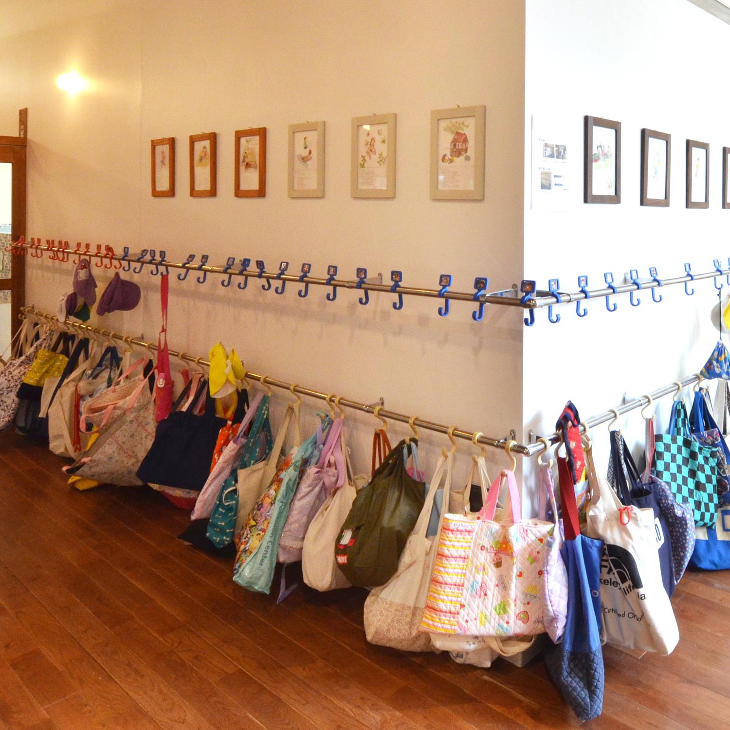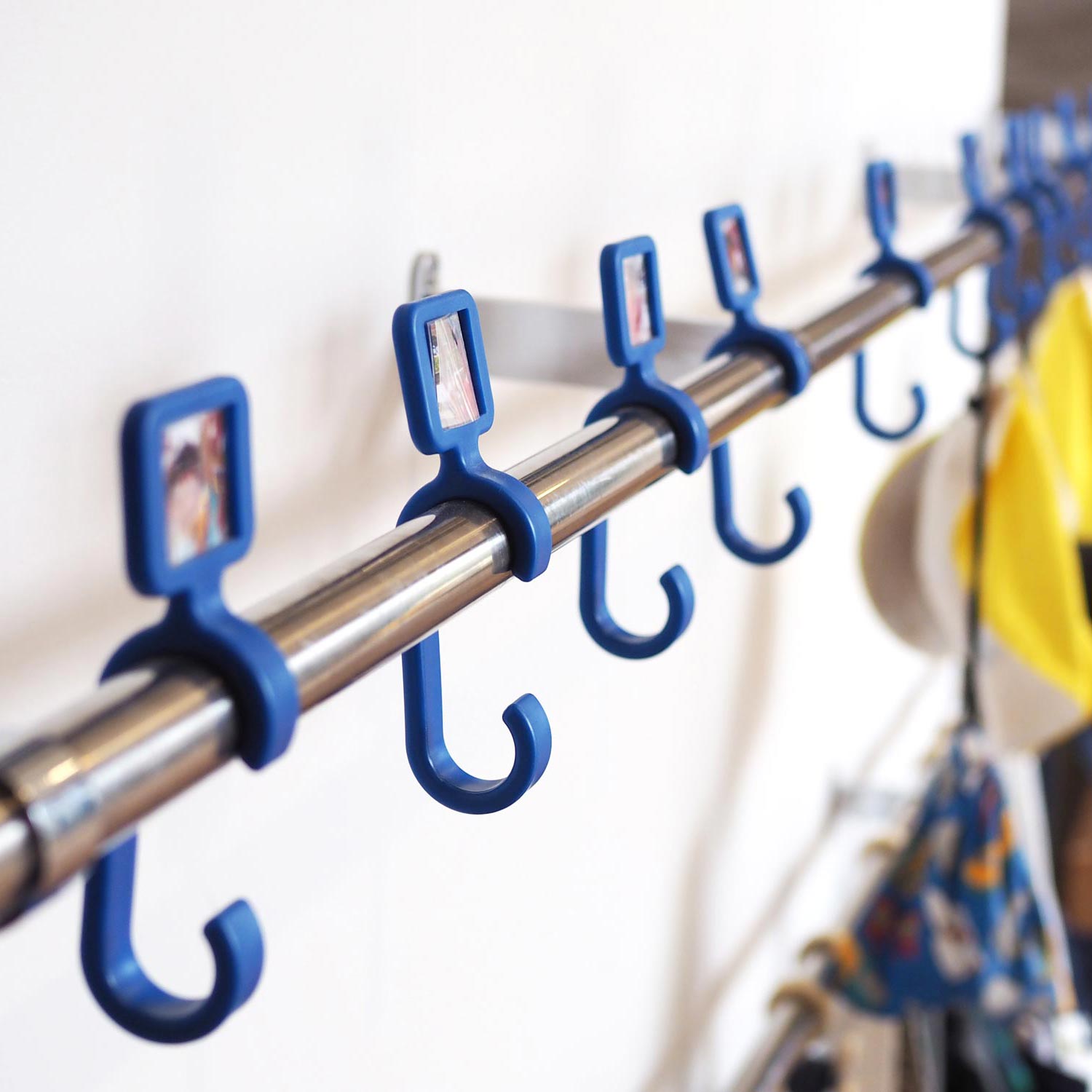 フックスタンドに取り付けられる横型フックです。フレーム部分に顔写真やイラストを入れて使います。適度にやわらかく弾力のある素材なので着脱が簡単であり、子どもが当たっても怪我をしません。既存のパイプに使う場合は、直径25mmのパイプであれば取り付け可能です。