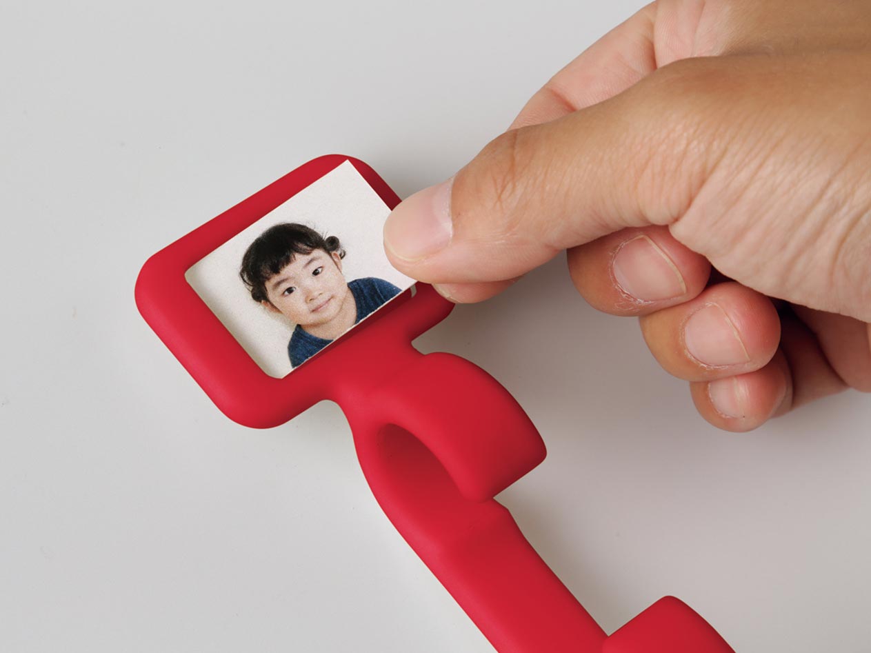 フレーム部分にイラストや顔写真を差し込んで使うフック。ペン先などの細いもので名札の後ろにある穴を押すと、差し込んだ顔写真などが取り出せるようになっているため入れ替えが簡単です。
