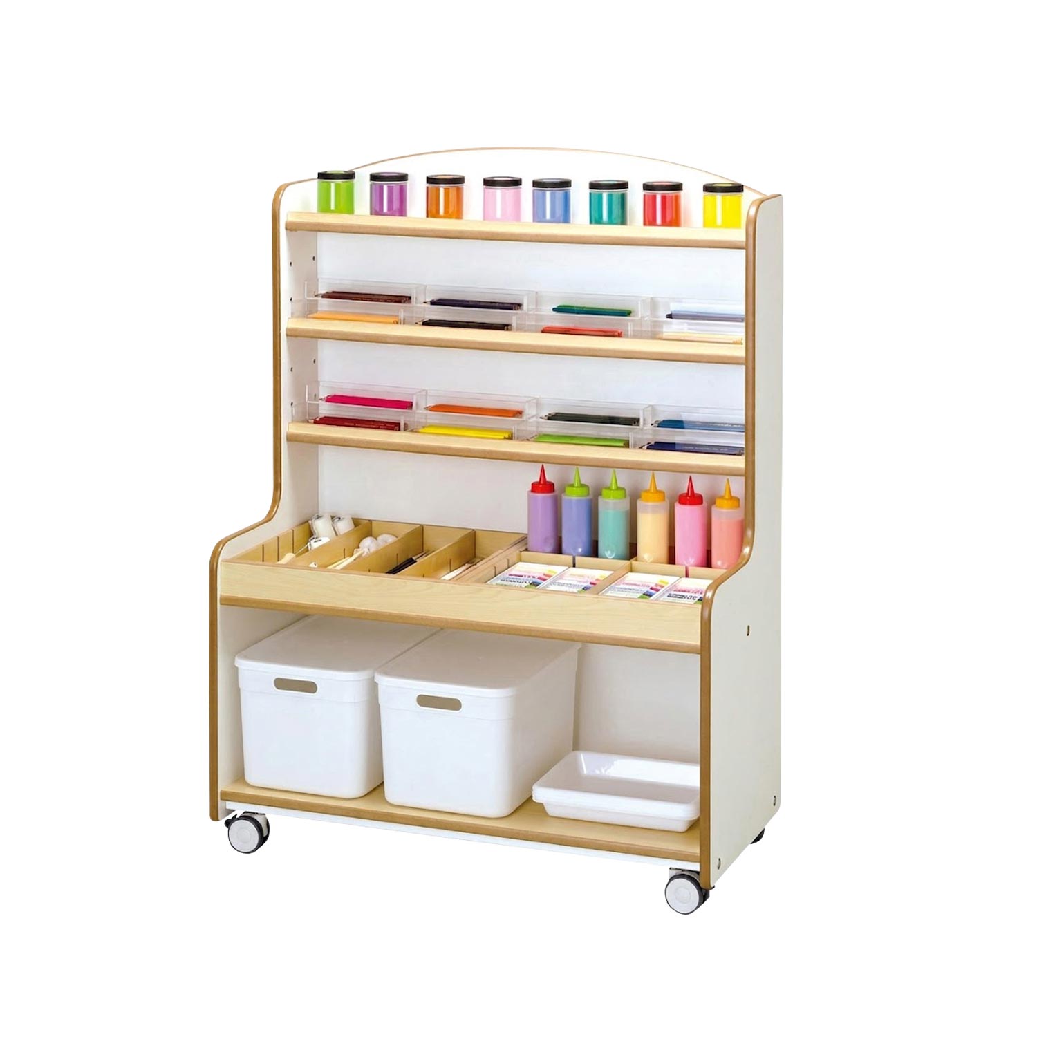 ごちゃごちゃしがちなお絵かき道具をすっきりまとめられるお絵かき道具棚。階段式のアクリルトレーにより、色鉛筆は色ごとにわけられるので、見やすく選びやすいです。筆やローラーは種類ごとに並べられるように仕切りがあります。また、棚下はバケツやトレーの収納スペースとしてお使いいただけます。