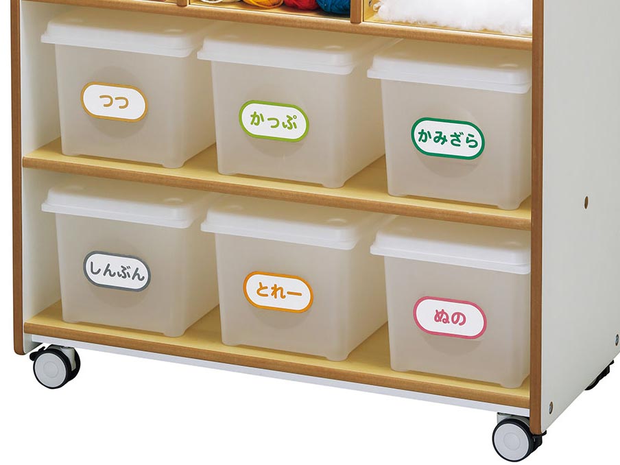 せいさくに使う材料の中でも新聞紙や紙コップなど、かさばる材料をメインに収納できる工作材料ワゴン。万能プラボックス6個を並べることができるので、種類ごとにわけて収納することができます。